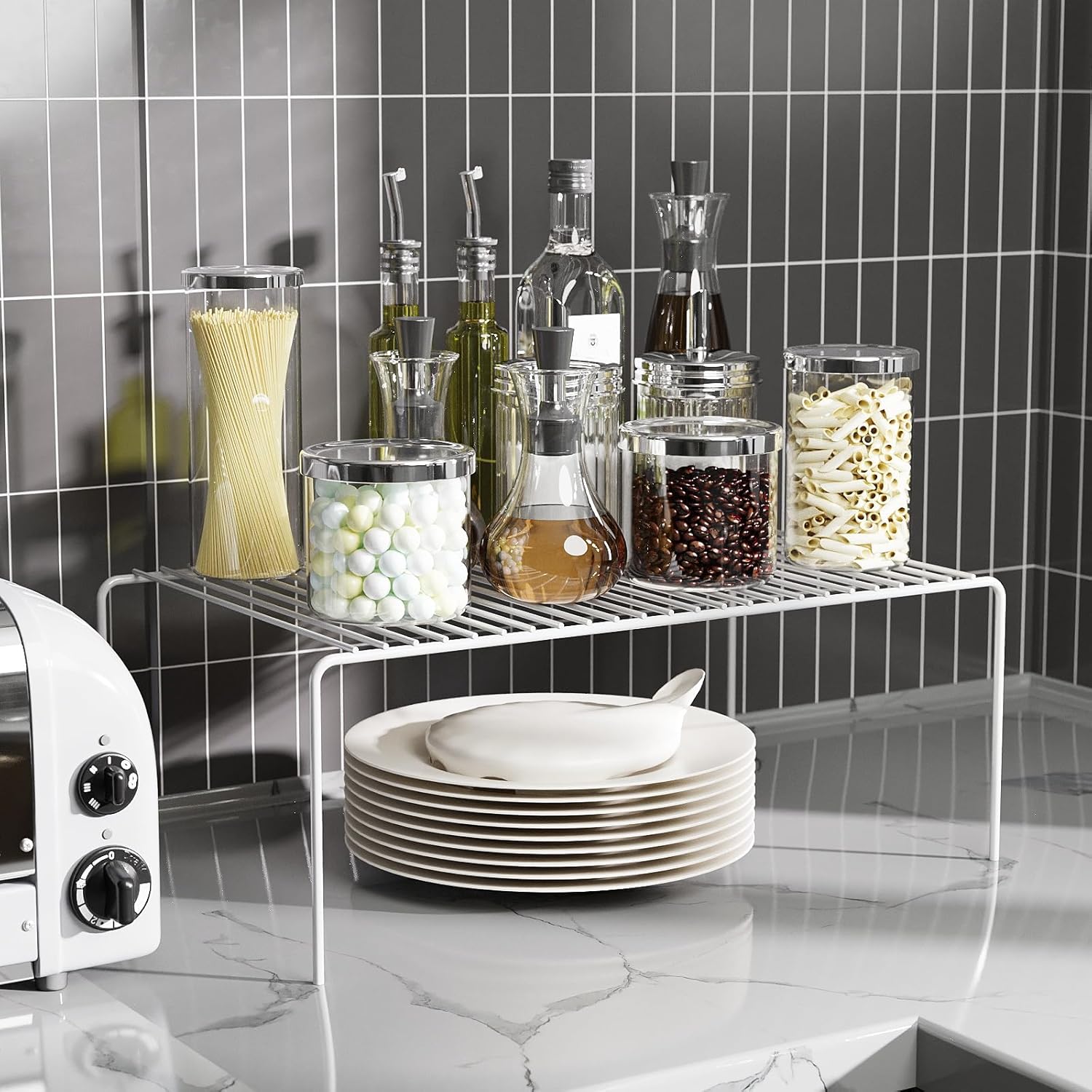 - Perfect Size: Each wire shelf measures 13''L x 9.4''W x 5.5''H. Perfect size makes this cabinet shelf rack perfect for you to organize your kitchen supplies, you can easily organize your jars, pots, pans and spices etc