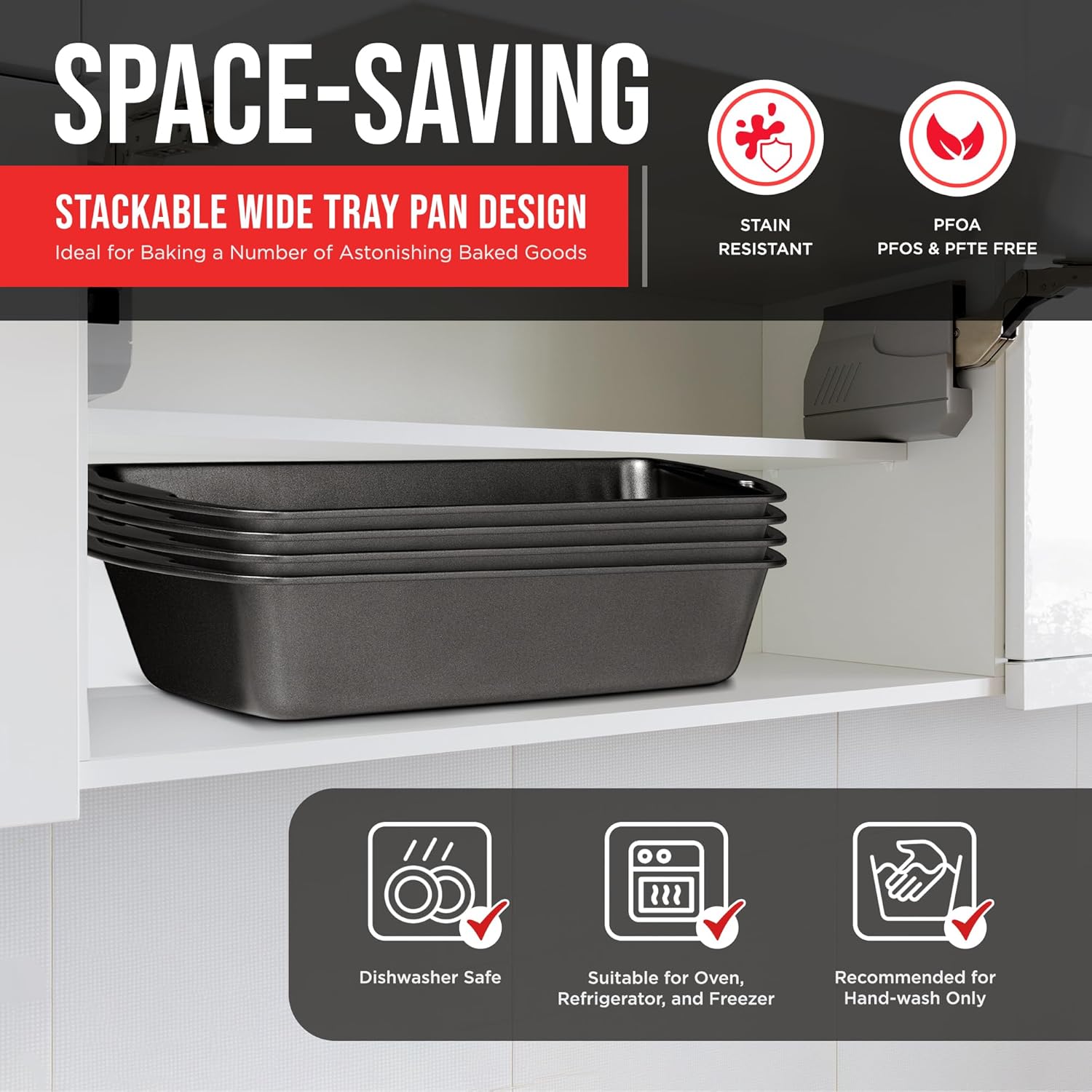 - SPACE-SAVING DESIGN - the stackable wide tray design of each of the 4 pans in our loaf pan set not only saves space in your kitchen but keeps your bakeware organized and ready for your next baking session. Make the most of your cabinet space and do away with pans that clutter your kitchen