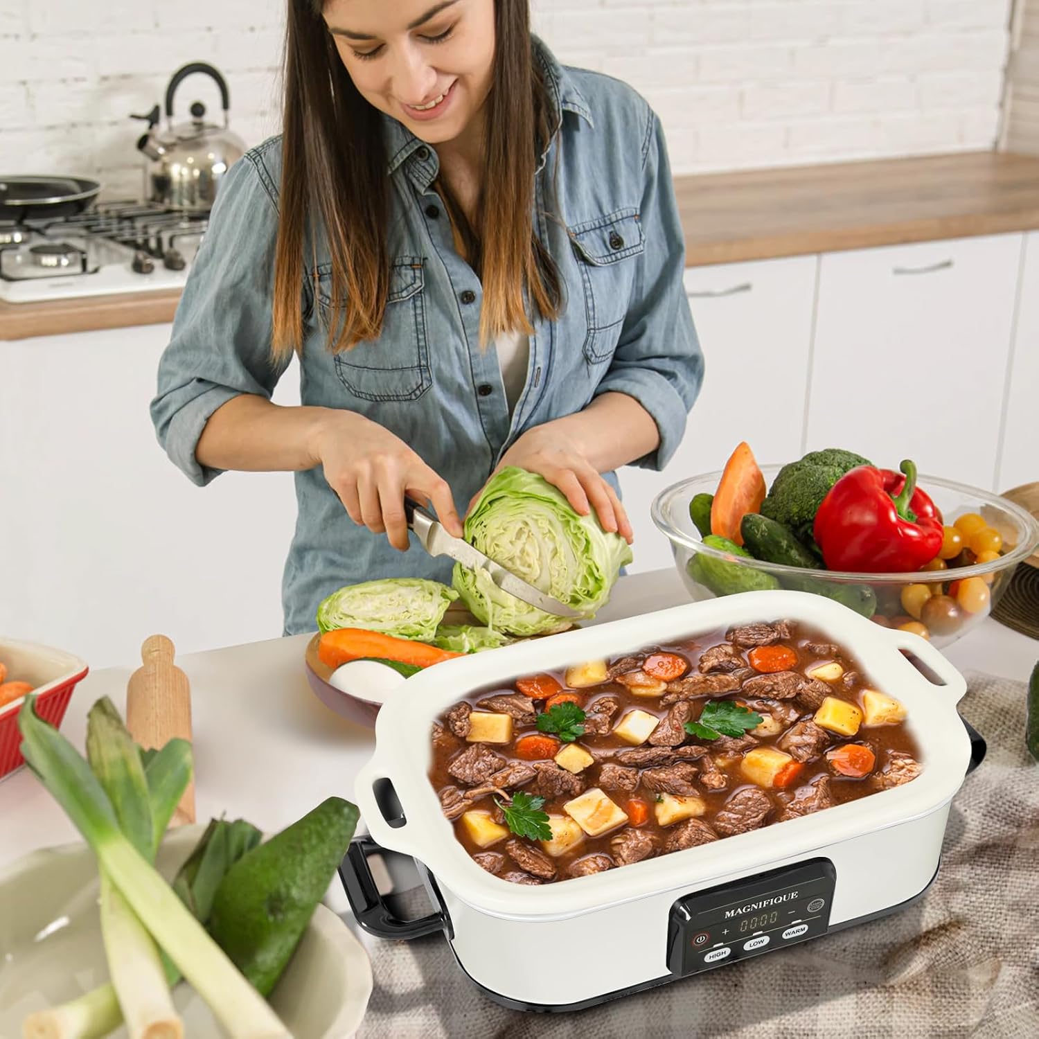 MAGNIFIQUE Small 4 Quart Casserole Programmable Slow Cooker with Ceramic Baking Dish - Perfect Kitchen Small Appliance for Family Dinners, Oven Safe and Durable Bakeware for Lasagna, Roasts (White)