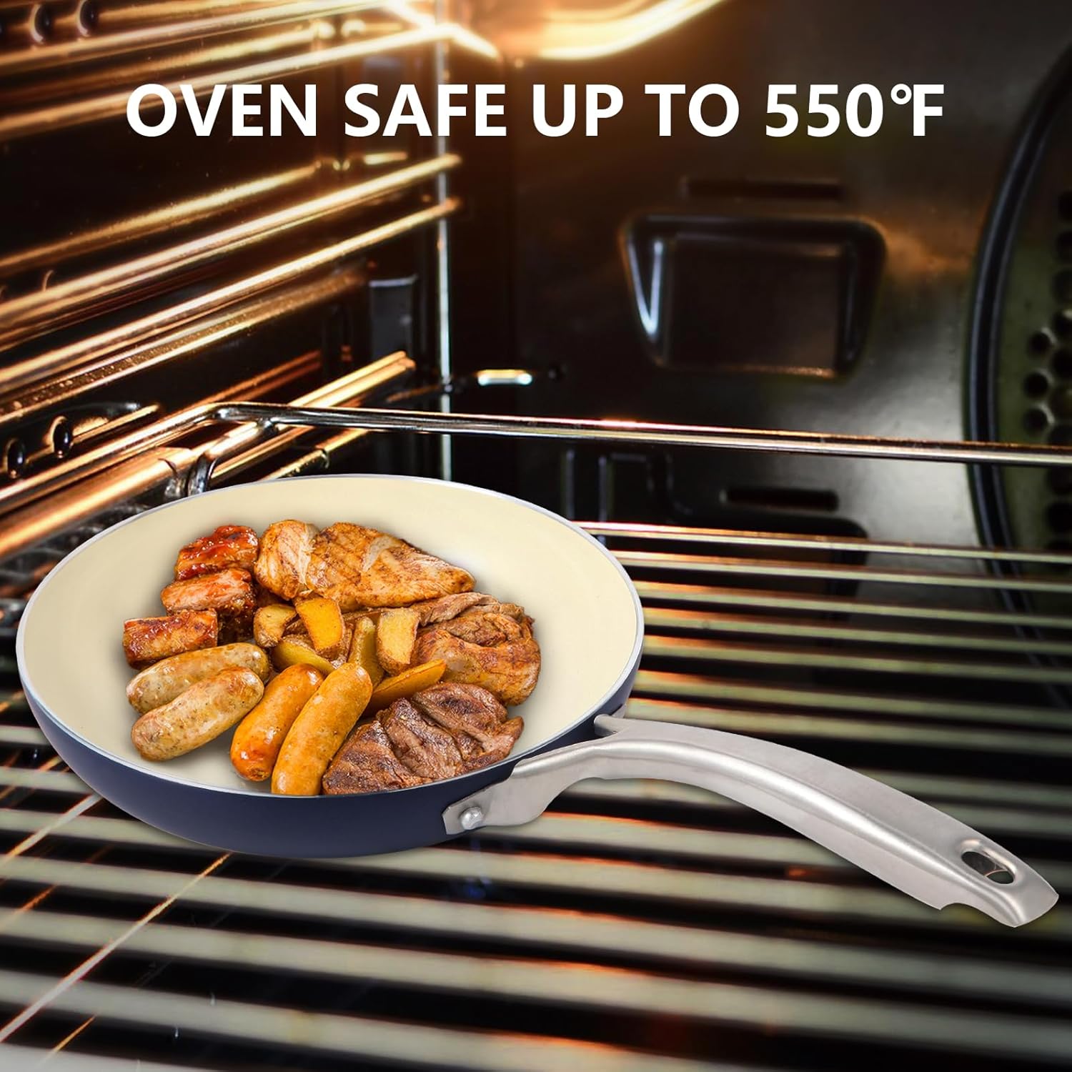 - 【Stovetop & Oven Safe】This nonstick cookware set is crafted from heavy-duty aluminum, heats up quickly and evenly. Low or medium heat is recommended while cooking. High magnetic conductive steel base is compatible with all stovetops including induction. M MELENTA non toxic cookware set is oven and broiler safe up to 550°F, providing you with more choice for cooking and baking