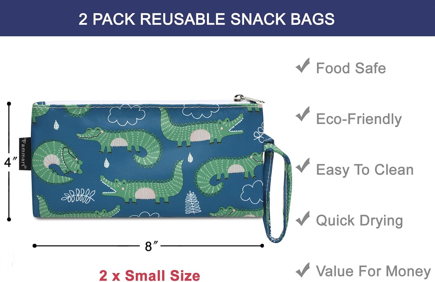 Reusable Sandwich Bag/Snack Bag for Kids & Adults, Dual Layer Lunch Bag with Handle, Washable, Food Safe, BPA Free (2-Pack, Green Crocodile)
