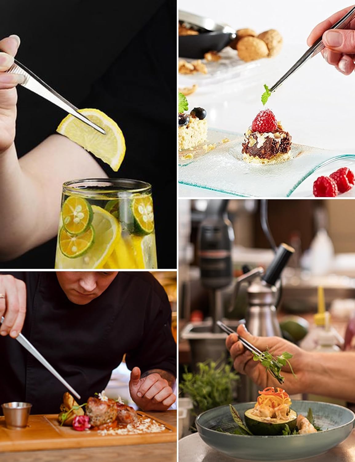 - PROFESSIONAL KITCHEN TWEEZERS - You can use tweezers to pick up some fine food, like pasta, caviar, kernels of corn, pine nuts and cranberries. It also good for decorate desserts, cakes and drinks. Is also perfect tool for grilling and flipping food