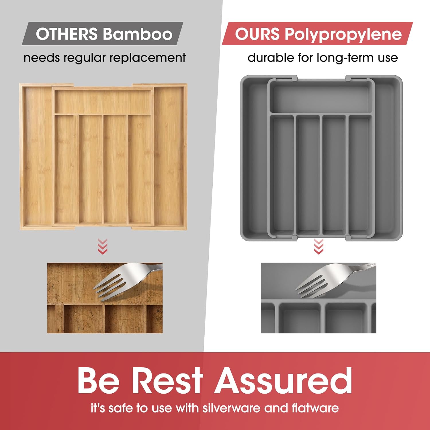 - LARGE CAPACITY: This kitchen utensil organizer comes with 5-7 compartments, creating more space in drawers for silverware, cutlery, and kitchen utensils. This installation-free gadget features a straightforward design—just place it in the drawer and let it work its magic, creating order effortlessly.