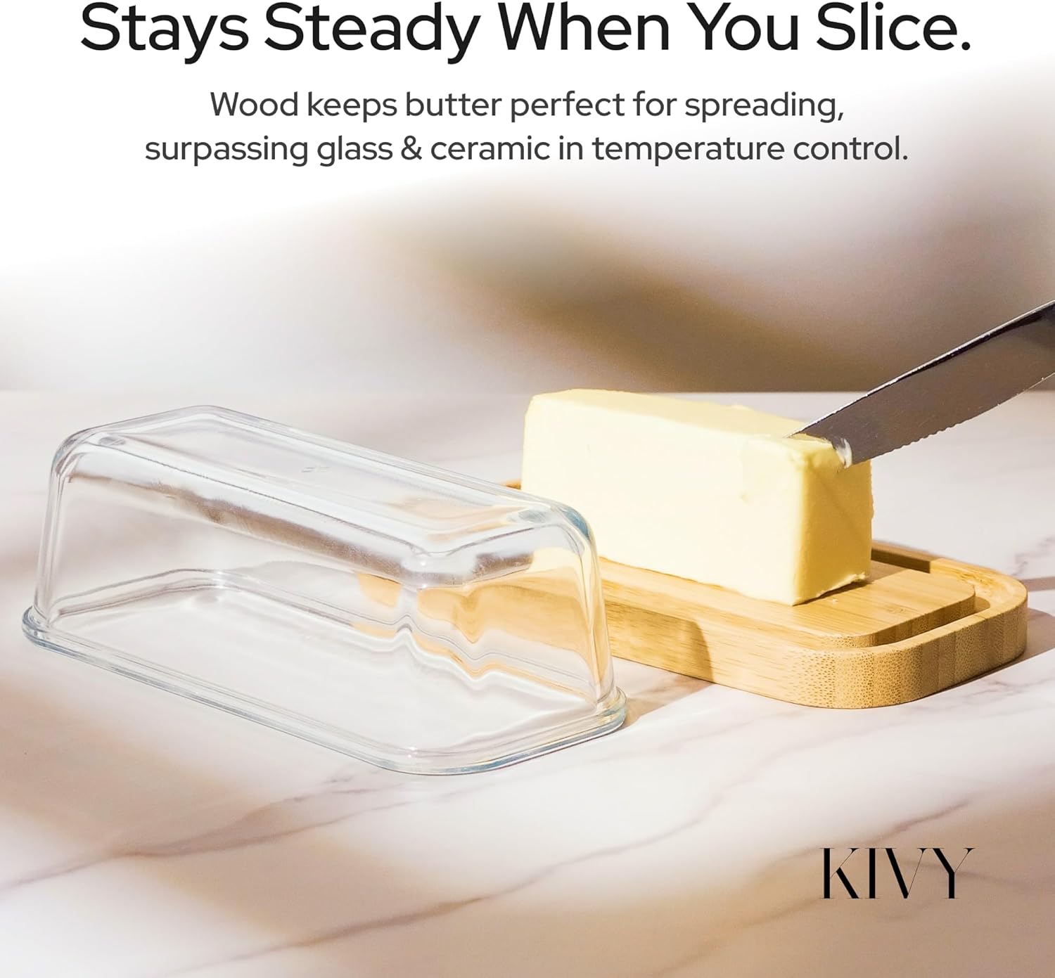 KIVY Glass butter dish with airtight lid that keeps butter soft - For countertop and refrigerator door shelf - Butter tray fridge - Butter holder for counter - Covered butter dishes with lid