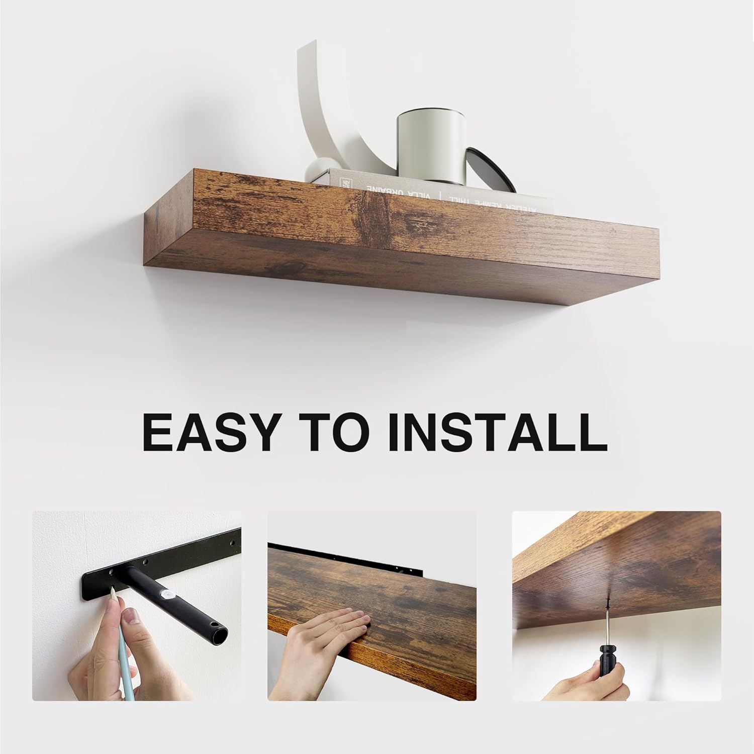 - VERSATILE AND STYLISH DESIGN: Elevate your space with our wall shelves available in wood, black, and white. These floating shelves come in three sizes (15 inches, 24 inches, and 36 inches) and feature a natural wood texture that blends seamlessly with any decor style.