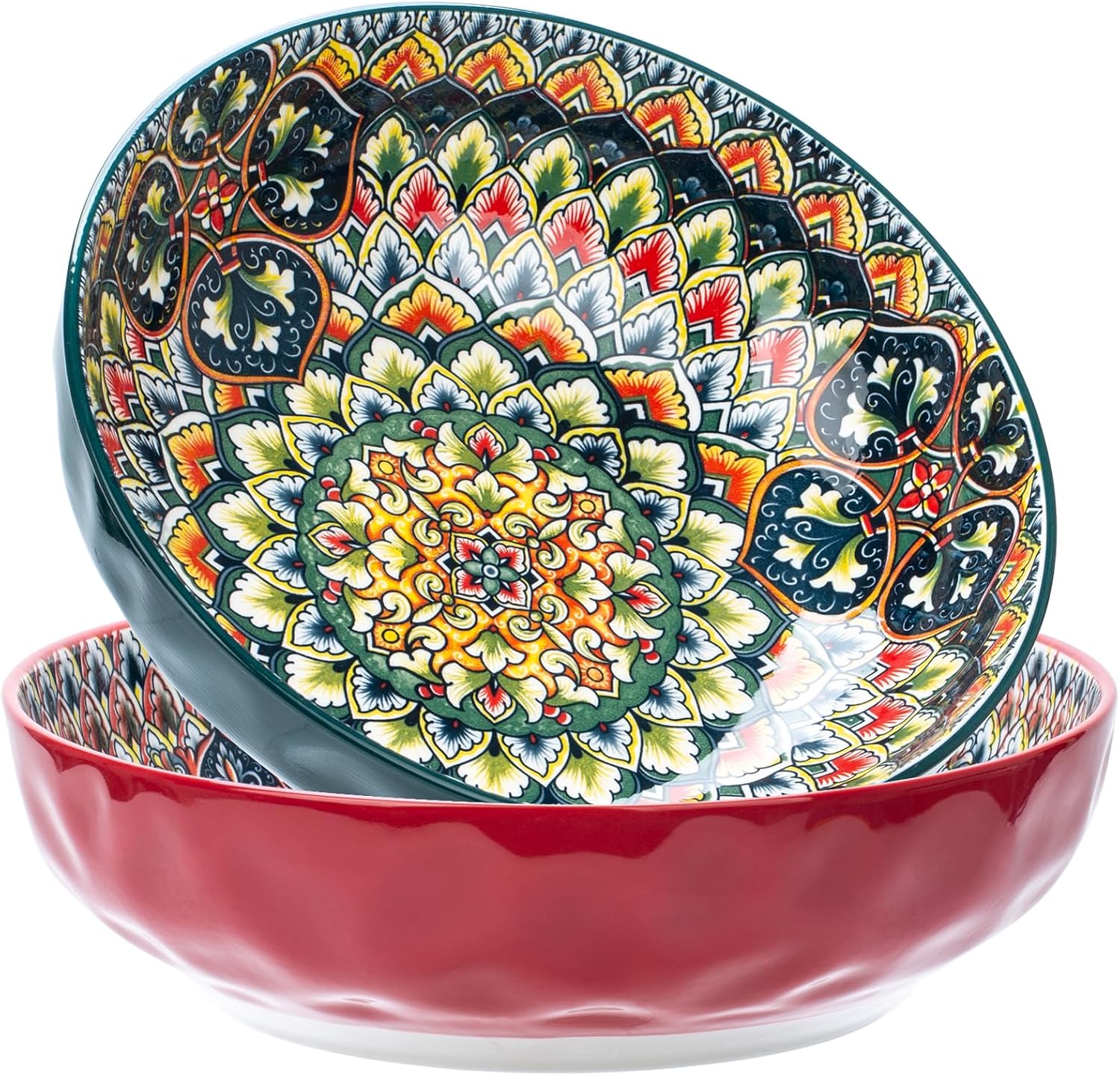 Large Serving Bowls, 75 Oz Fruit Salad Bowls Set of 2, Bohemian Style Large Porcelain Dishes for Entertaining Parties,Big Bowls for Salad, Pasta, Fruit, Chips, 10.3 Inch Diameter (green.red)