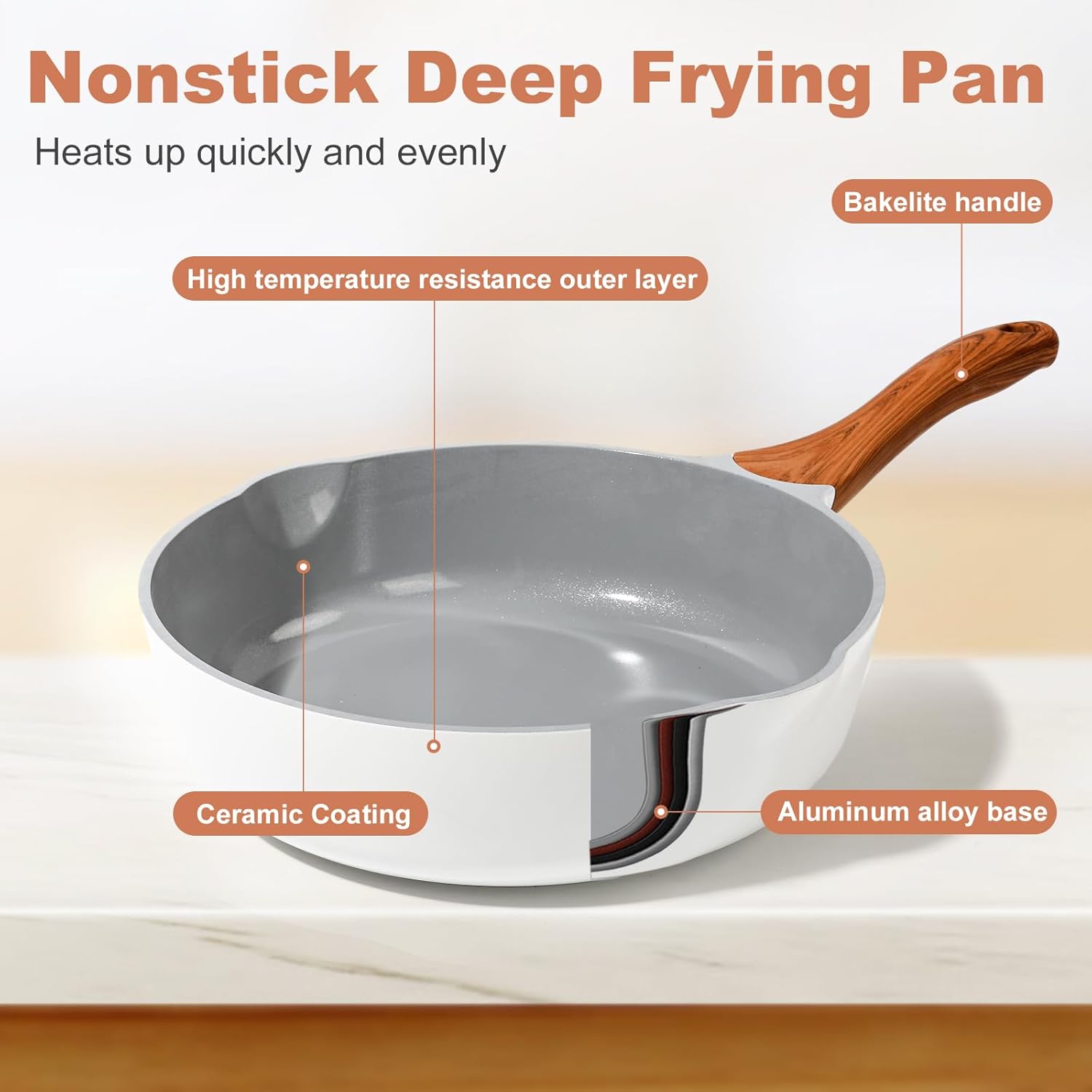 Nonstick Frying Pans With Lid, 11 Inches Skillets Deep Frying Pan Non stick, Ceramic Frying Pans With Pour Spout, Non Toxic Frying Pan for Stove, Induction, Gas, PB/CD/PFOA Free (White,11 Inches)