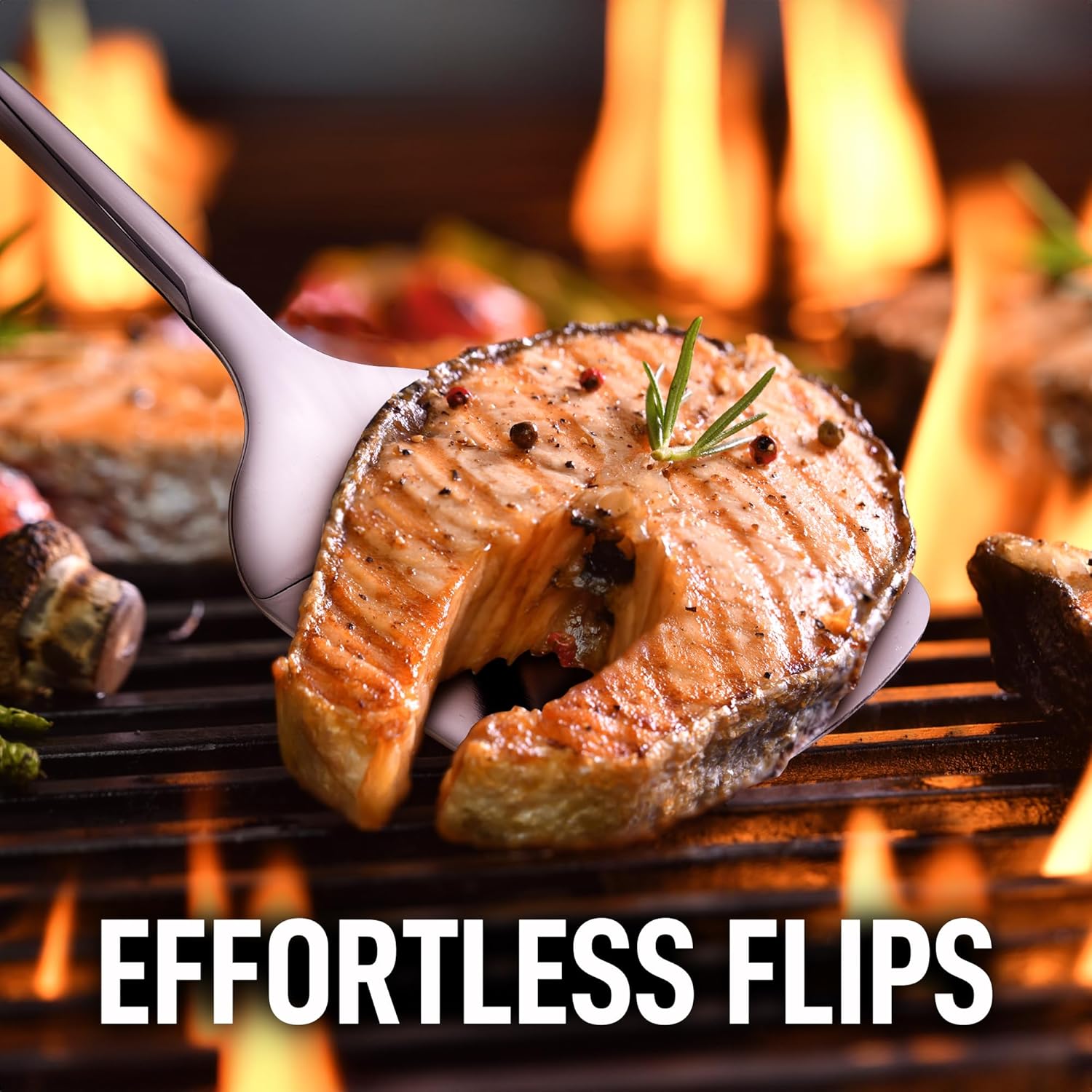 - ERGONOMIC EASY GRIP HANDLE: This stainless steel slotted turner is stylish, sturdy, and was built with a convenient length of 14.8 inches that is engineered to prevent oil splash when pan-frying or avoiding heat when grilling. Durable steel design does not bend at all when turning or lifting heavier foods. The slotted head is ideal for stir-frying or grilling as the oil or butter easily drains through the slots. Handle is designed for comfort when cooking.