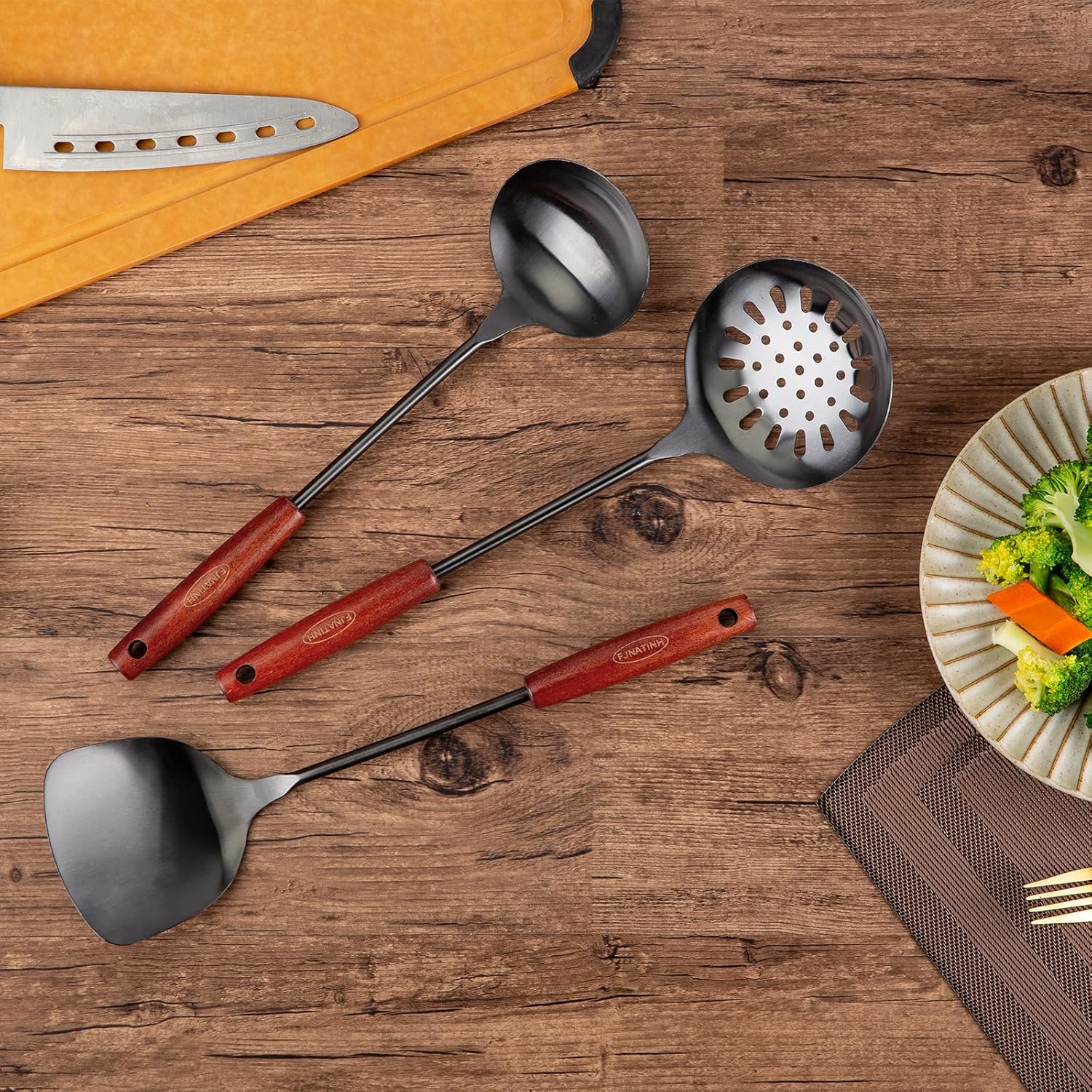 - 【Design of the Kitchenware Set】 the wooden handle is ergonomic, the stainless steel is durable and heat-resistant,and the appearance is classic. Specially designed for cooking food, it can be easily turned and cooked to help you make delicious dishes