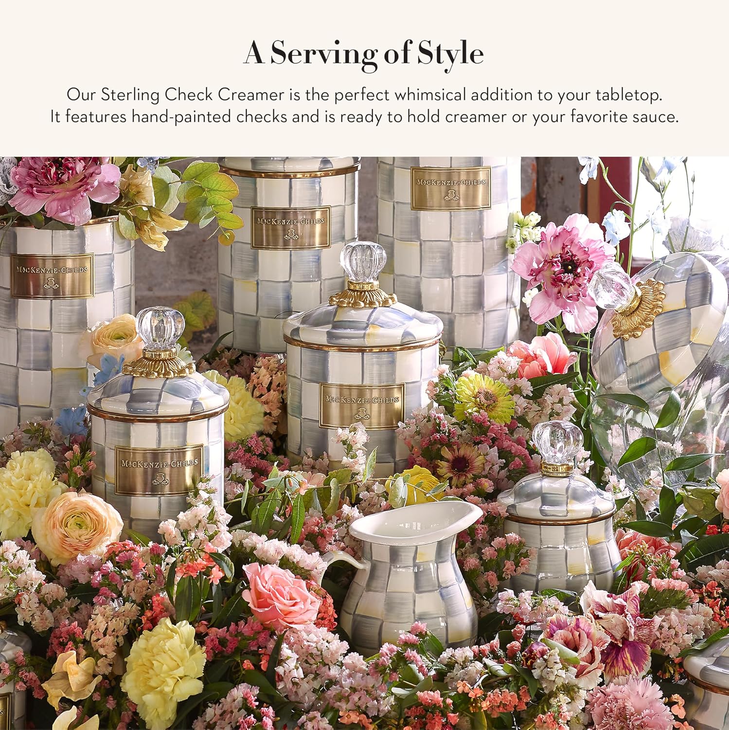 - ELEGANT KITCHEN DECOR: This cream dispenser is decorated with hand-painted high-contrast checks in our subtle gray-and-white Sterling Check pattern so you can store your café condiments in style. It has a small container pour spout for easy serving.