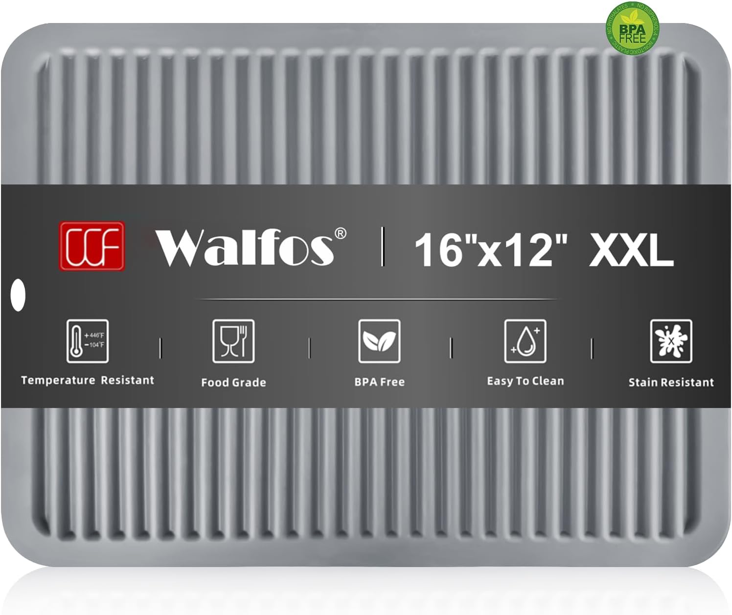 - 16 INCH LARGE SILICONE TRIVET: Walfos extra large trivet allows you to better prevent large hot dishes, pots, appliances, etc. from scalding your countertop, preventing spills and keeping your countertops organized. Made from food-grade silicone, Walfos pot holders are BPA-free and will not attract odors, stain, rust or crack. Size: 16'' x 12'' x 0.22''