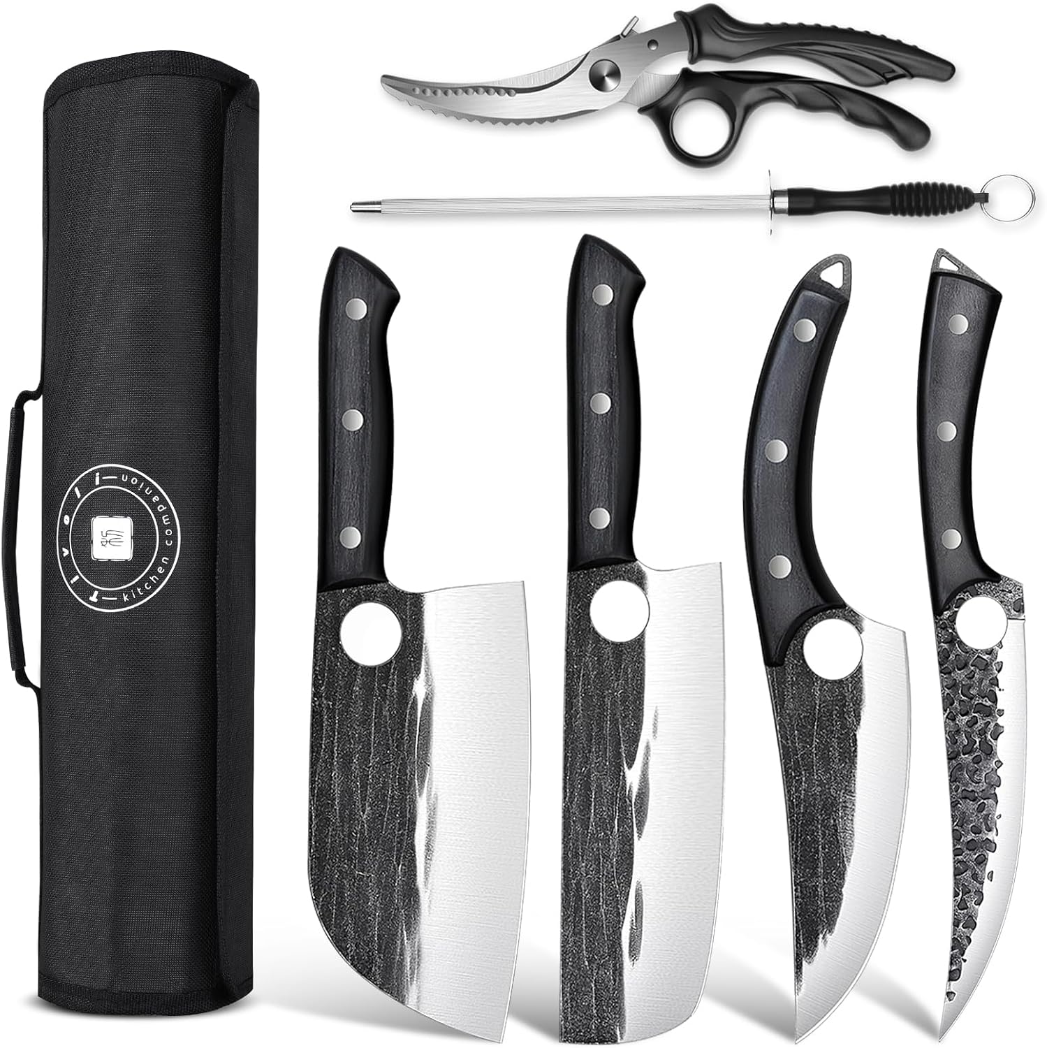 - 【Professional Butcher Knife Set Multi-functional】: The Tivoli meticulously crafted Kitchen Knife Set includes: Nakiri vegetable knife, Serbian chef's knife,Fillet knife, Boning knife, along with a professional sharpening rod and a sharp pair of poultry shears.This versatile chef knife set is your ultimate choice for slicing, dicing, chopping meat, deboning chicken and fish, whether for home cooking or professional kitchens.
