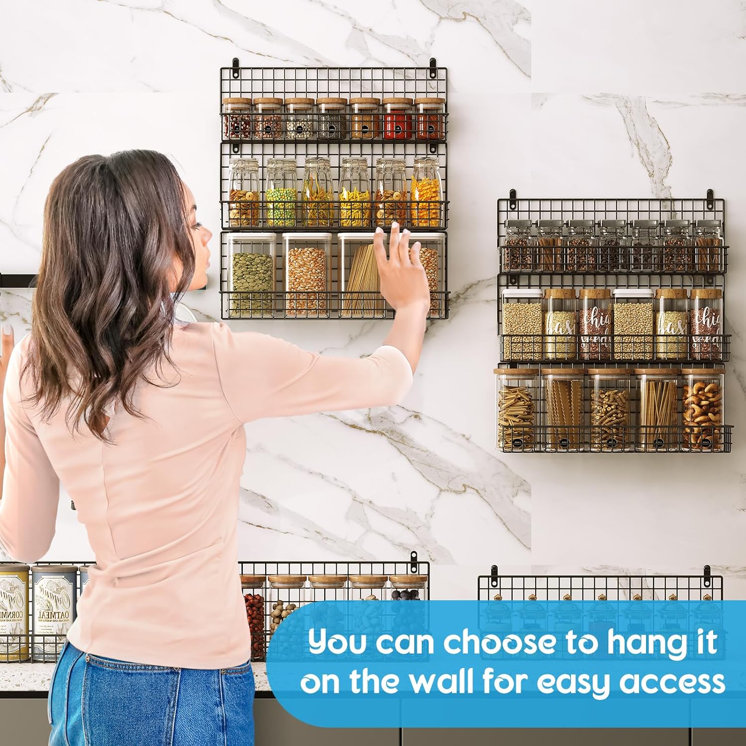 - 【Easy to install】No drilling is required to mount our pantry organizer to any standard door, and with the non-marking stickers there is no need to worry about the product wobbling erratically. You can also use the included screws to attach the product to the wall. You can combine the three different sizes of spice racks and freely adjust the spacing of the products, or use each basket individually.