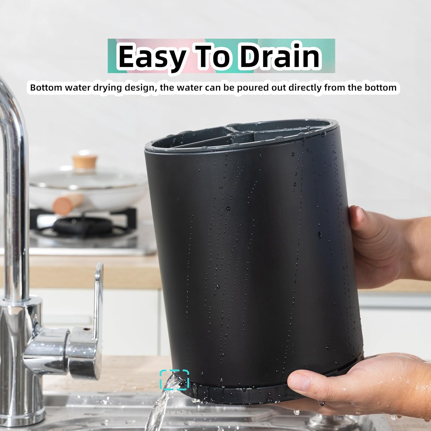 - 360° Rotating Utensil Holder: The 360° utensil caddy with rotating design makes it cooking tools are easy to use and also a great stress relieving companion in the kitchen.The large base of the utensil caddy on the kitchen countertop is equipped with 4 non-slip rubber pieces to secure utensils and prevent scratching the kitchen surface. It provides a simple and efficient storage solution for all your kitchen utensils.