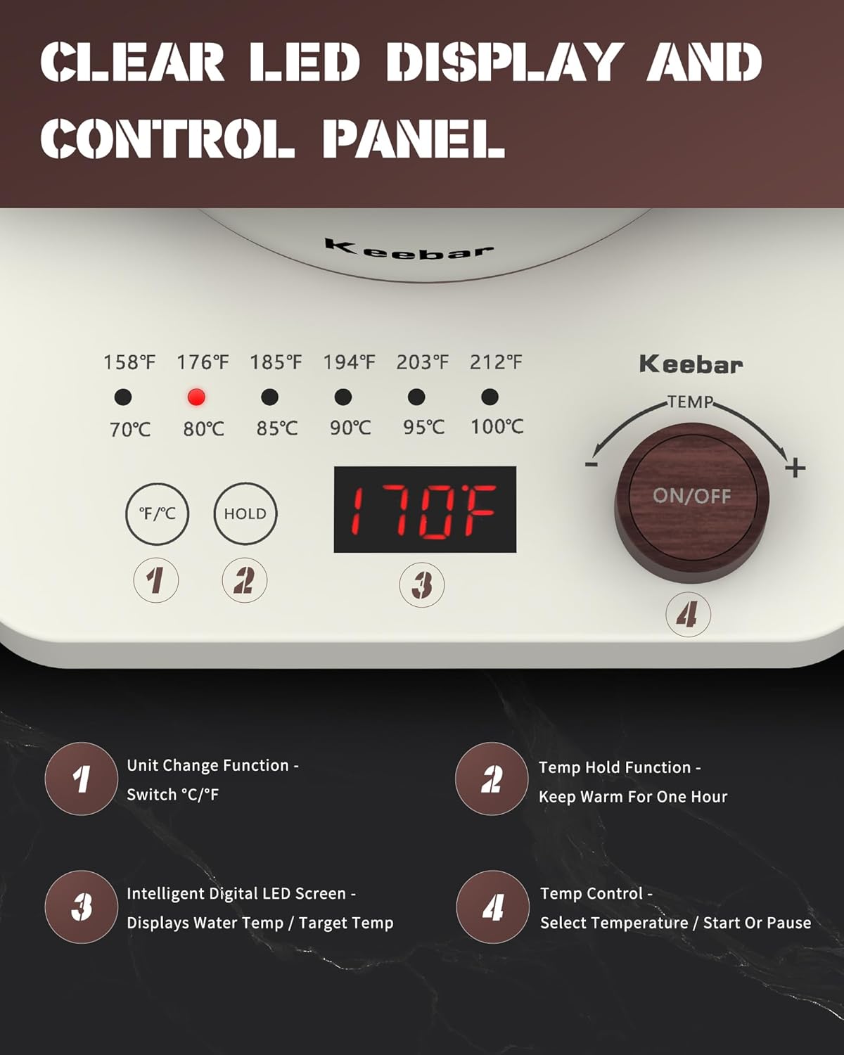 - 6 Easy Presets & Keep-Warm Control - Elevate your brewing experience with six preset temperatures ranging from 158°F to 212°F. Easily adjust the settings with a simple twist of the knob and switch between Fahrenheit and Celsius. The LED screen displays the real-time water temperature, while the keep-warm function maintains it for up to 60 minutes.