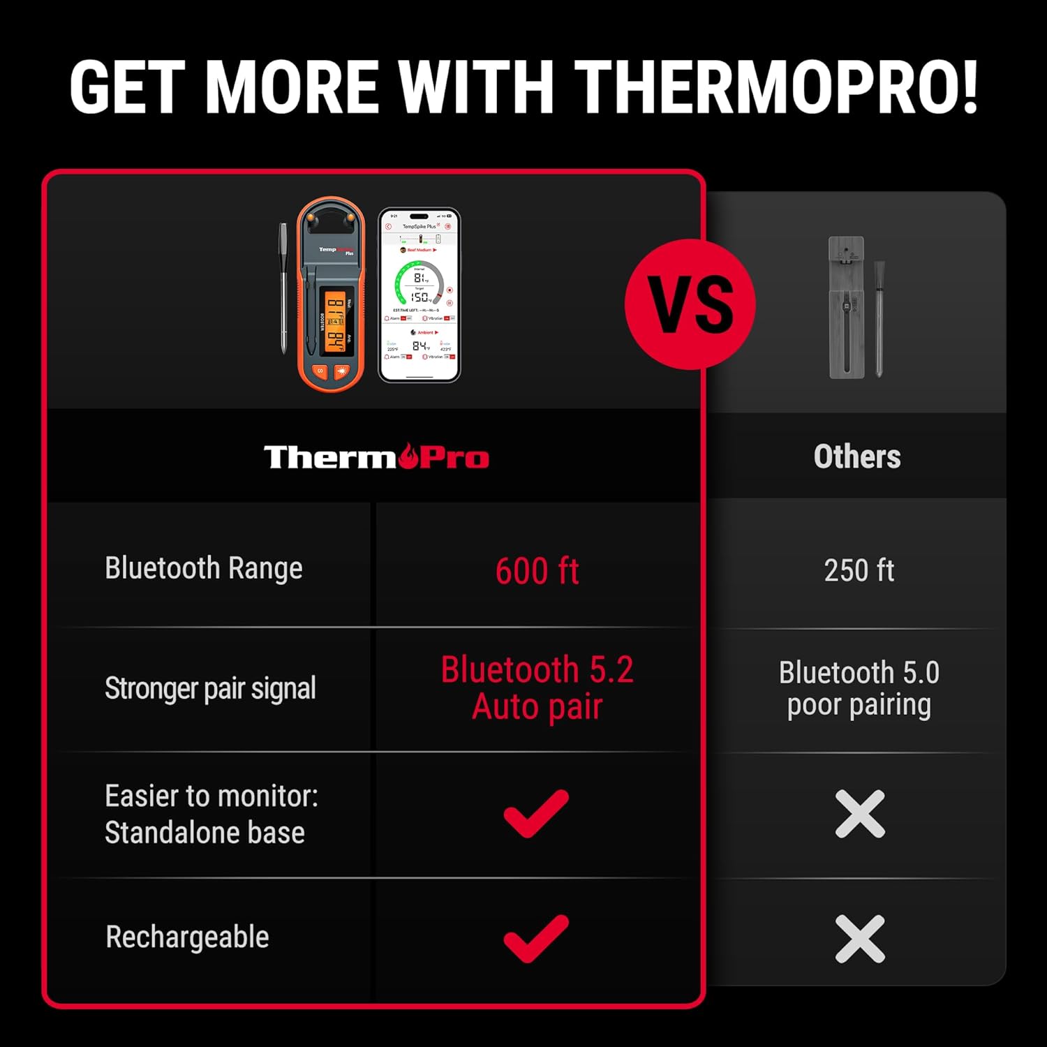 - ăLonger Range 600 ftăPowered by advanced Bluetooth 5.2 technology, this Bluetooth thermometer provides accurate readings up to 600 ft away, enjoy the freedom to monitor the cooking progress without being tied to the grill/oven/smoker/rotisserie