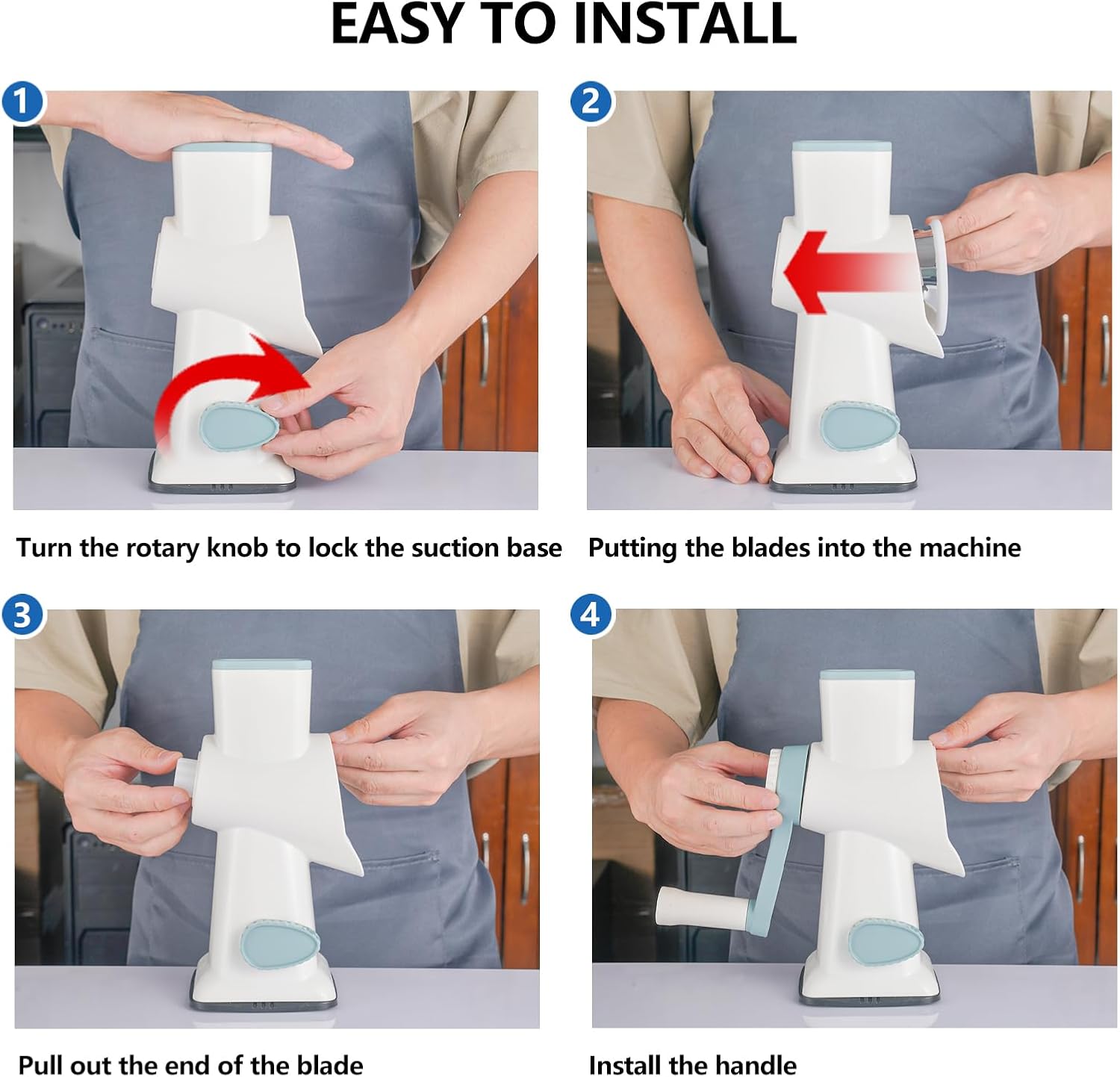 - Easy To Clean and assemble: The rotary cheese grater can be taken apart and cleaned separately. The three blades and handle are removable, very convenient for your kitchen storage,Blades are dishwasher safe