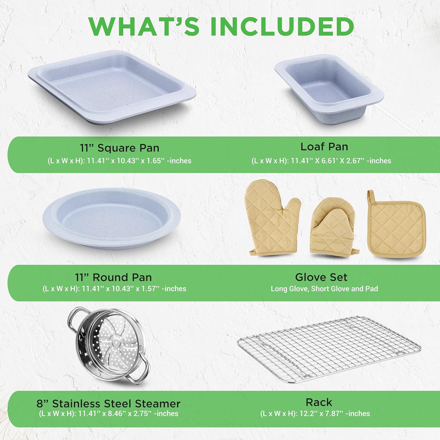 - MARBLE NON-STICK COATING - Enjoy durable non-stick performance with our black cookware set, including 4 pans and 5 pots with lids. Bakeware set includes: roaster pan, square pan, baking tin, muffin pan and loaf pan. Nylon Utensil Set. Knife Set Gadget Set.
