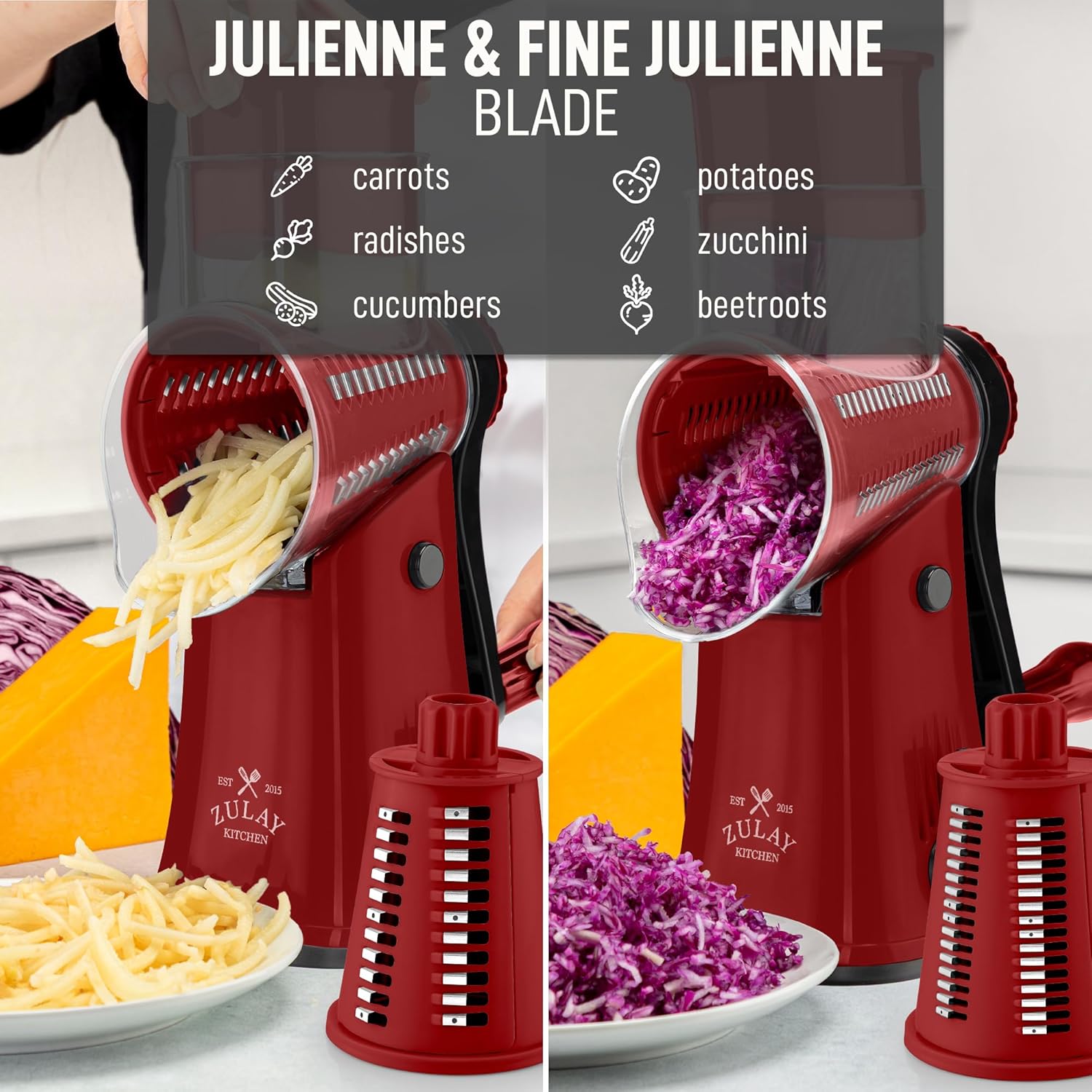 - GRATE, SLICE, AND SHRED: With 5 interchangeable stainless steel blades, this rotary grater is perfect for thin and wavy vegetable slicing, coarse shredding, and fine and coarse julienne. The sharp blades of this multifunctional grater are perfect for grating with carrots, cucumbers, potatoes, nuts, cookies, and even a soft block of cheese.