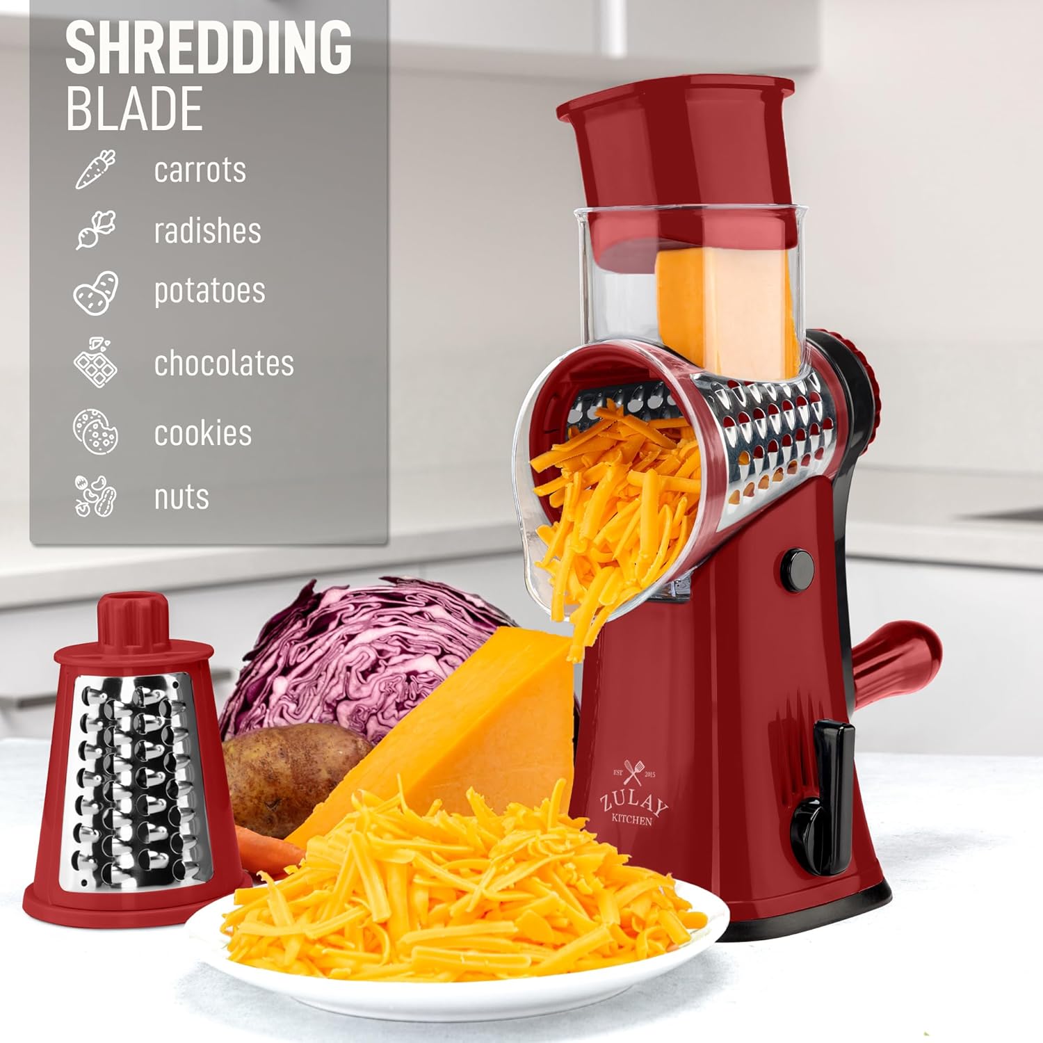 Zulay Kitchen Rotary Cheese Grater 5 Blade Cheese Shredder - Manual Hand Crank Cheese Grater With Reinforced Suction & 5 Interchangeable Drums - Easy to Use, Vegetable Chopper Round Mandoline Slicer