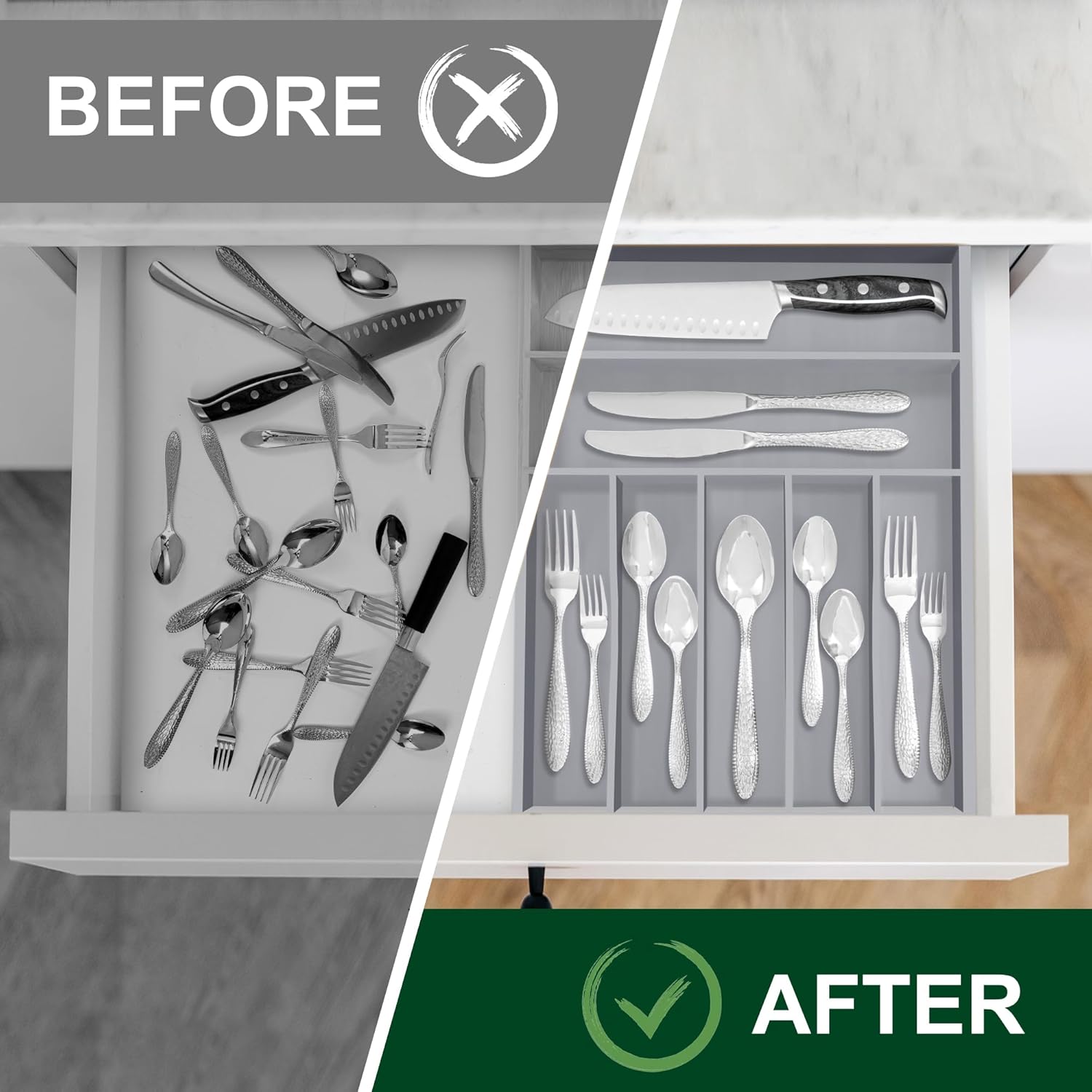 - ăKeep all you need at handăStop worrying about finding utensils when you cook. 7 deep compartments make our silverware organizer a good assistant for cooking. When all every cutlery is neatly arranged in our drawer cooking is also become easier. Clear your flatware & utensil and enjoy cooking with a cheerful heart.