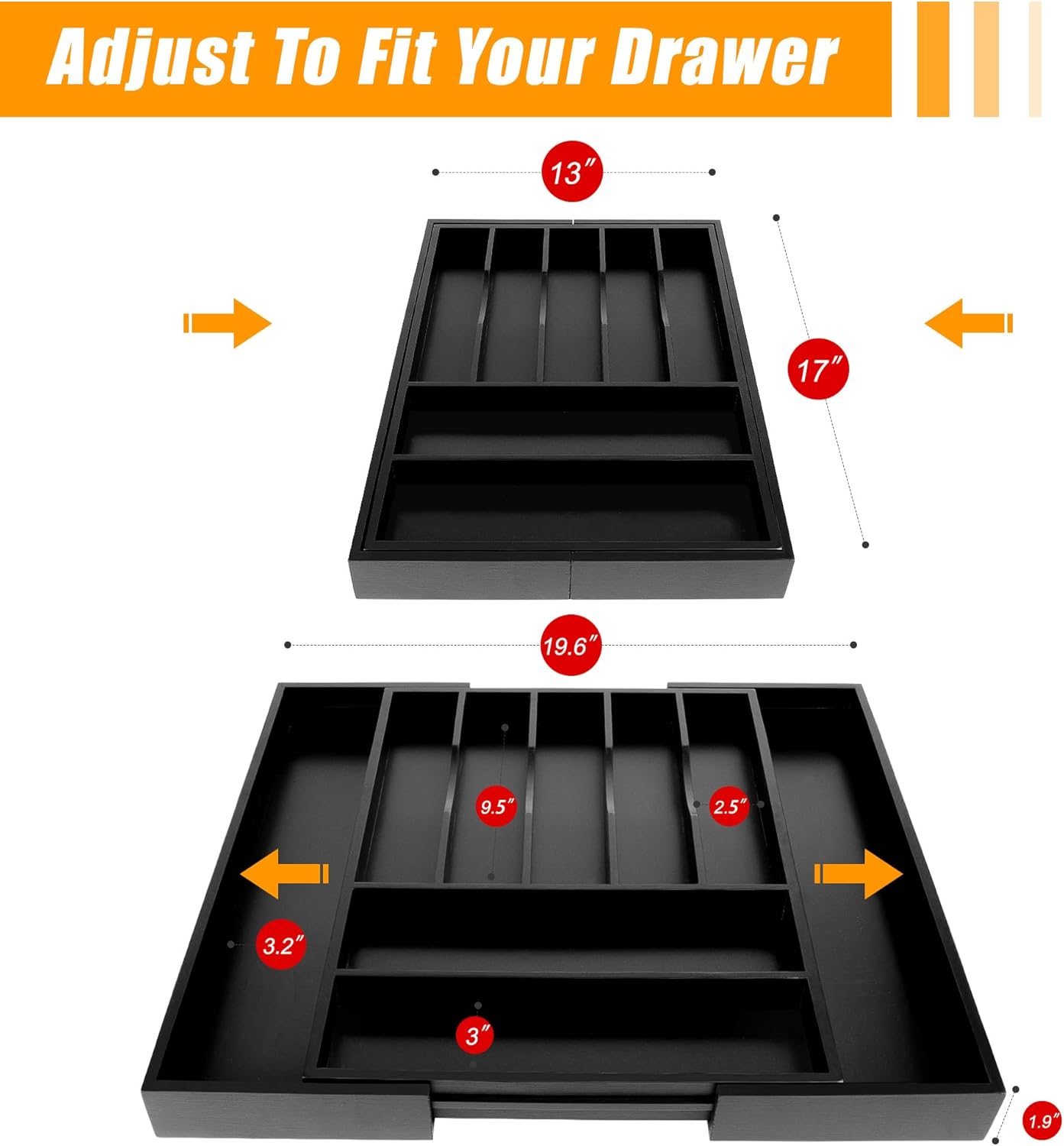 - â ăExpandable - fit most kitchen drawers.ăOur large utensil silverware drawer organizer flatware cutlery tray are adjustable in width, expanding from 17"x13" to 17"x19.6" as needed, with a depth of 1.9" . The utensil silverware drawer organizer is crafted from natural bamboo that has been grown for over 4 years. Each silverware drawer organizer made of bamboo is meticulously handcrafted by seasoned artisans to ensure a smooth, smooth surface. You can confidently allow your family or children to use our silverware drawer organizer.