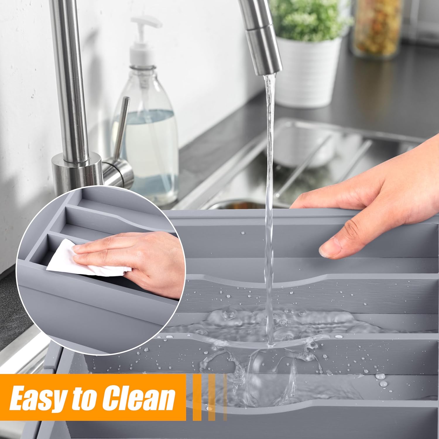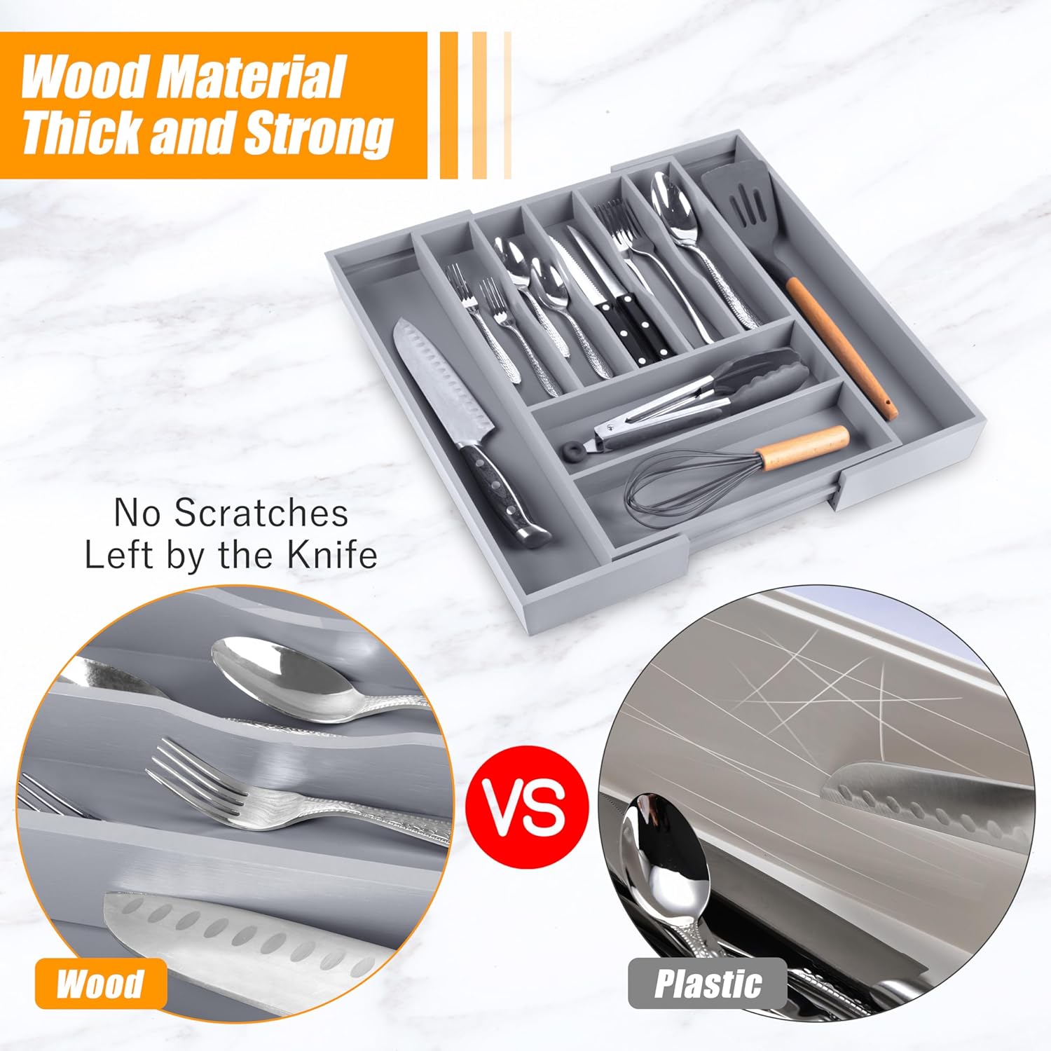 - â ăExpandable - fit most kitchen drawers.ăOur large utensil silverware drawer organizer flatware cutlery tray are adjustable in width, expanding from 17"x13" to 17"x19.6" as needed, with a depth of 1.9" . The utensil silverware drawer organizer is crafted from natural bamboo that has been grown for over 4 years. Each silverware drawer organizer made of bamboo is meticulously handcrafted by seasoned artisans to ensure a smooth, smooth surface. You can confidently allow your family or children to use our silverware drawer organizer.