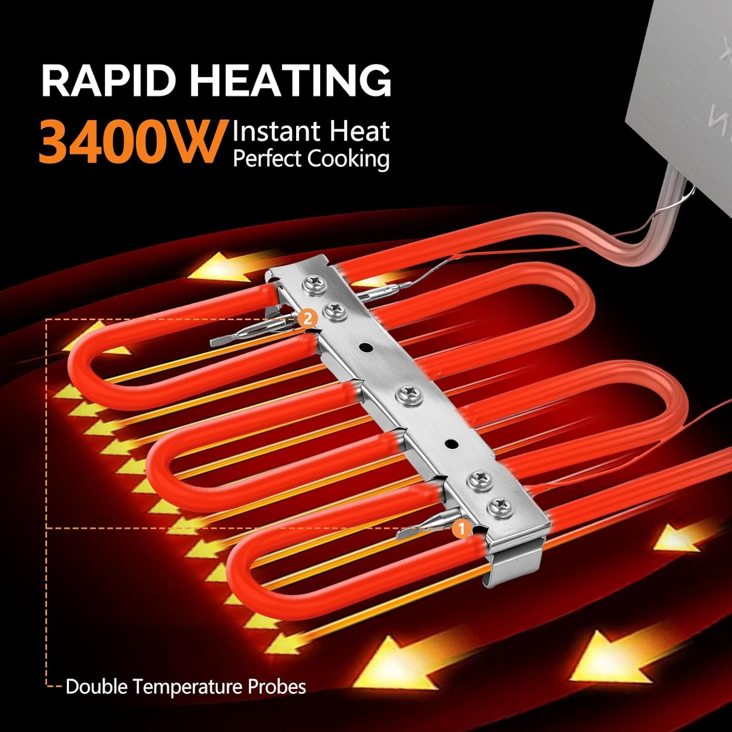 - 【24.9QT Large Capacity】The maximum capacity of each tank is about 12.5QT. Total maximum capacity 24.9QT. Recommended total oil capacity up to 15QT/14.16L (7.5QT for each tank). Single Basket Capacity: 6.55QT. What’s more, each side has a power plug, which allows to operate each side separately and fry different kinds of food at the same time. MAX power: 3400W (1700W for each plug). (NOTE: There are white protective tapes on surface. Please peel off them before use.)