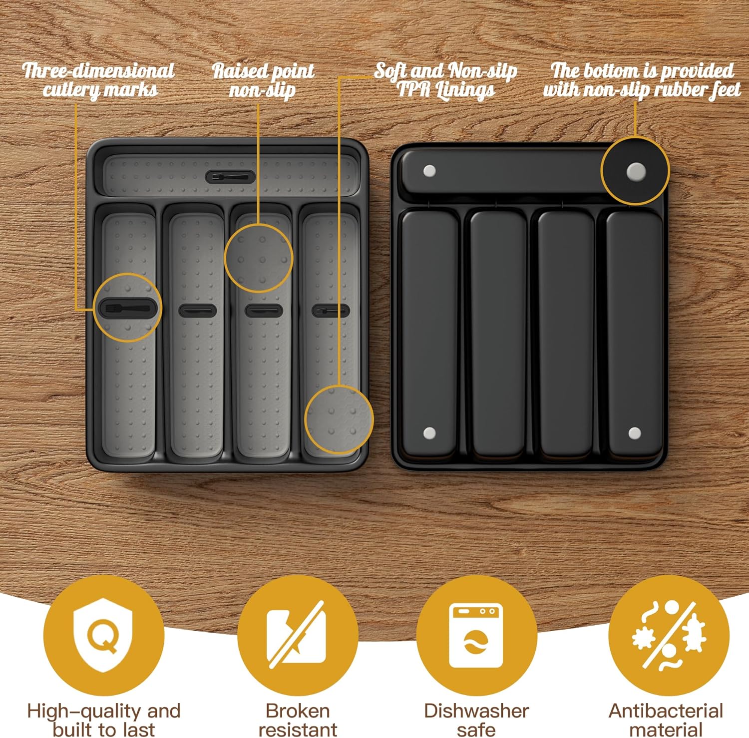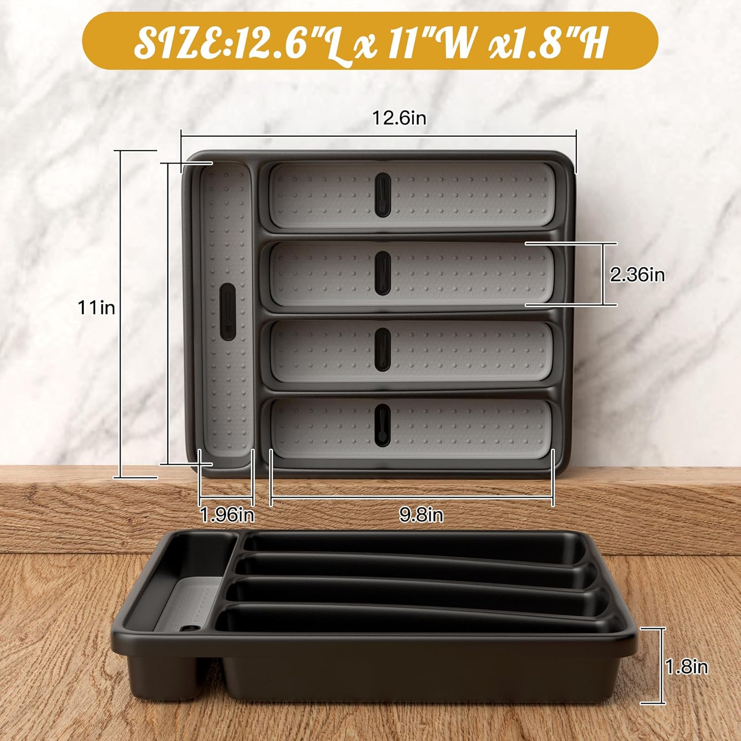 - Durable & Scratch-Proof Design for Everyday Safety Crafted from BPA-free plastic with soft TPU-lined slots, this cutlery tray protects your silverware and utensils from scratches. The non-slip rubber feet keep it firmly in place, even when drawers are opened quicklyâno sliding or tipping. Safe for delicate items like jewelry or makeup brushes, itâs built to last through daily use in busy kitchens, damp bathrooms, or kidsâ rooms.