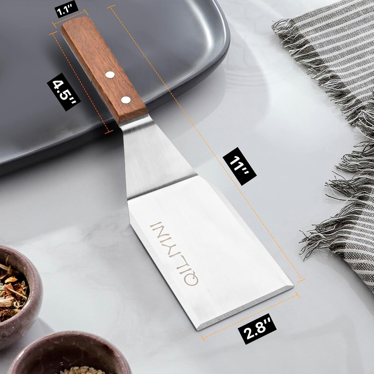 - Heat-resistant and Comfortable Wooden Handle - The metal spatula for cast iron skillet with wooden handle measures 11 inches long and is angled for maximum comfort and control. It is well-balanced and super sturdy. Hand wash only
