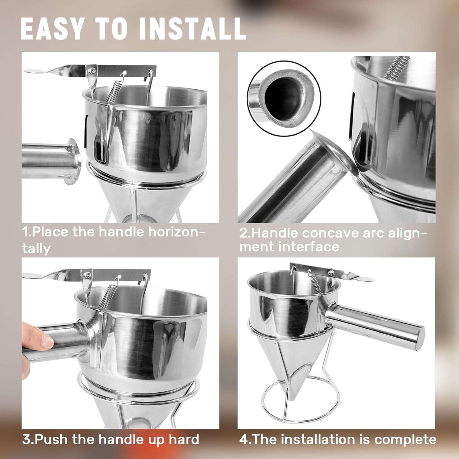 - Premium Pancake Batter Dispenser Set: Experience convenience with our stainless steel batter dispenser kit, including a dispenser with rack, grip handle, four silicone mouths (sizes: 0.31"/8mm, 0.47"/12mm, 0.55"/14mm, 0.67"/17mm). Capacity: 1200 mL.