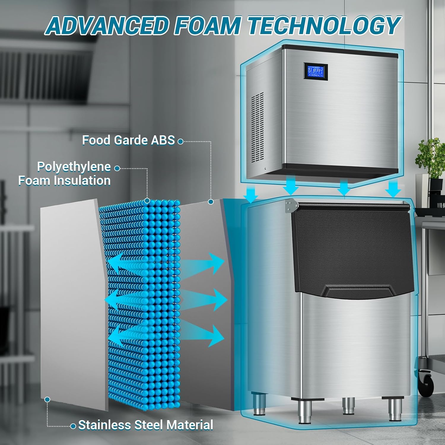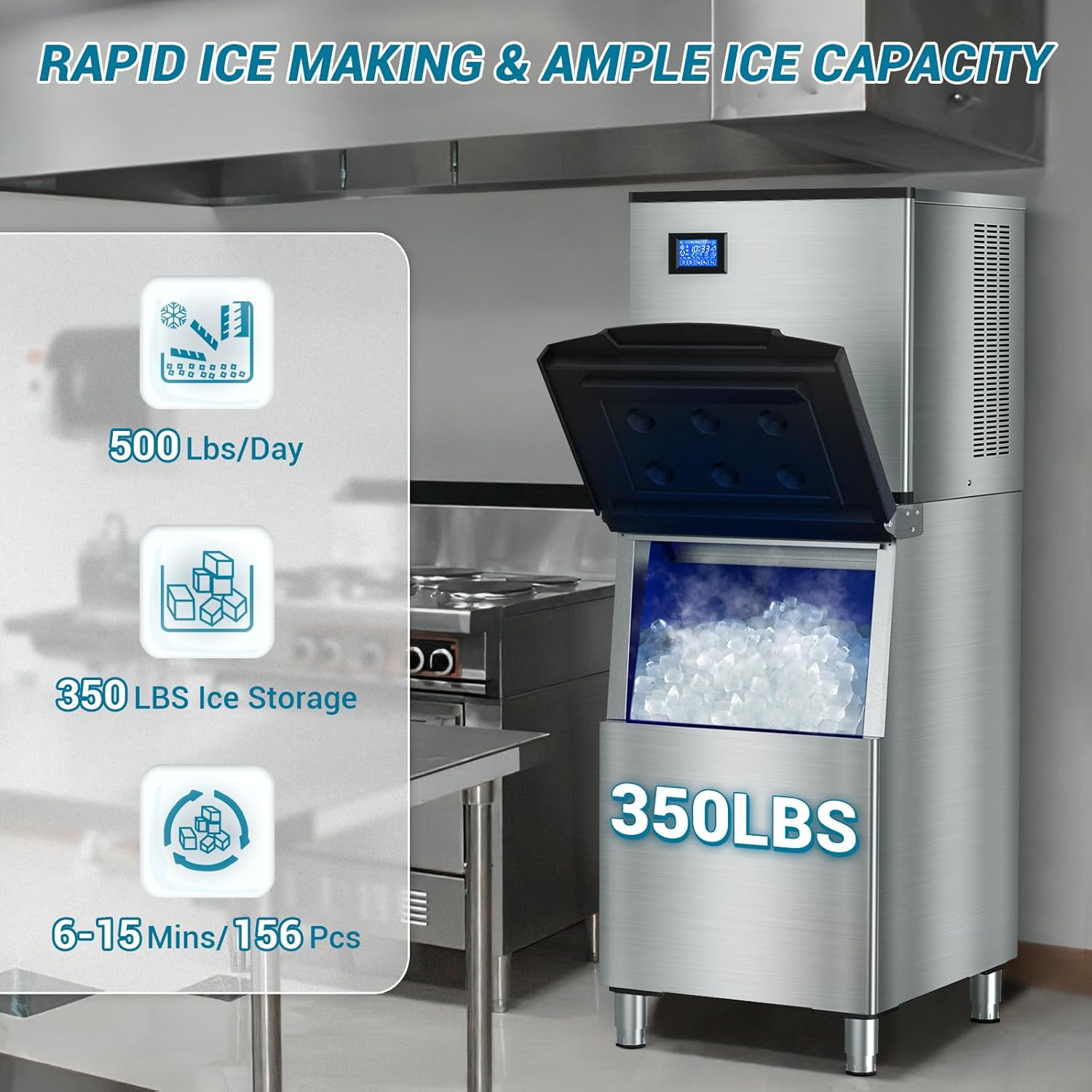 - High Ice Production Capacity & Ample Ice Storage Capacity - The commercial ice machine has a remarkable production capacity of 500lbs of ice per 24-hour cycle, and with its impressive 350lbs ice storage bucket, ensuring an abundant supply of ice for your business needs.