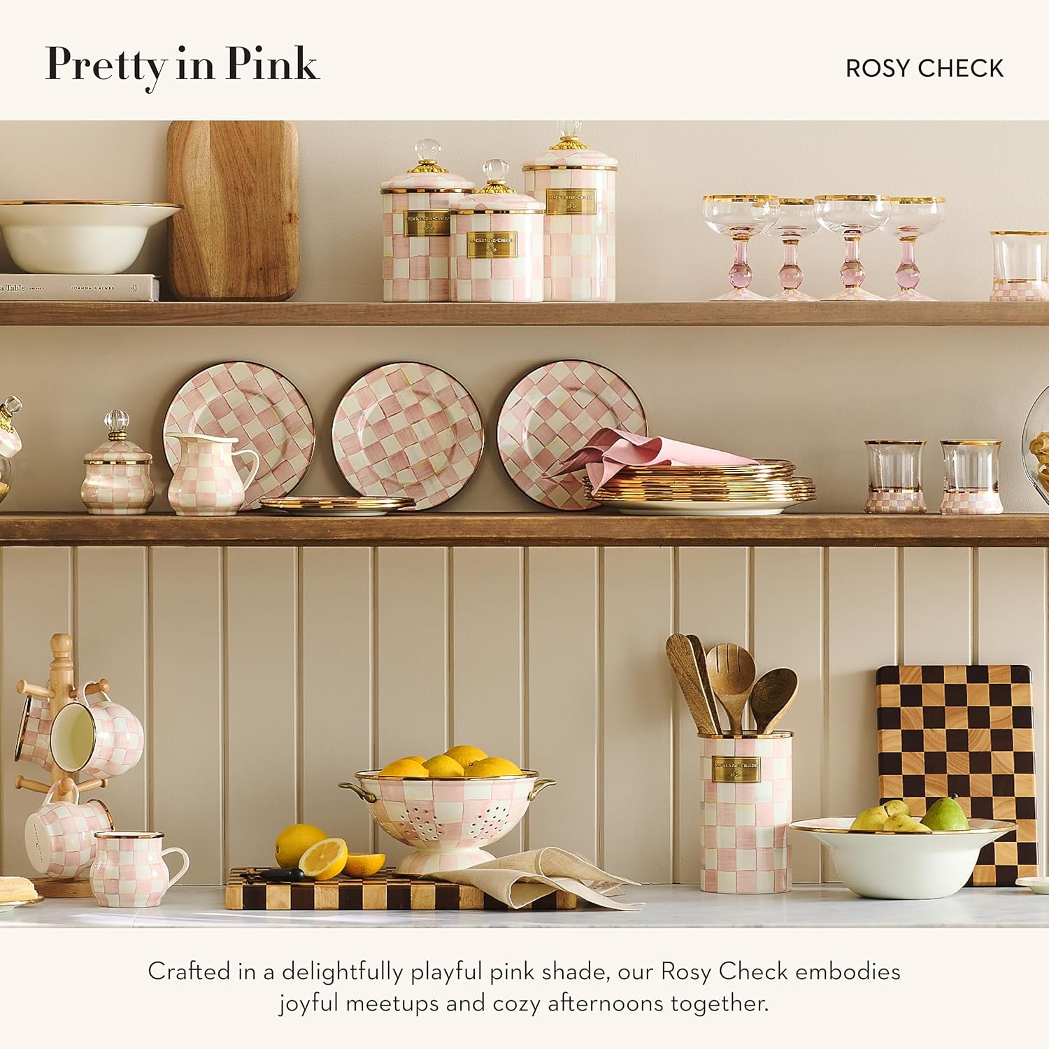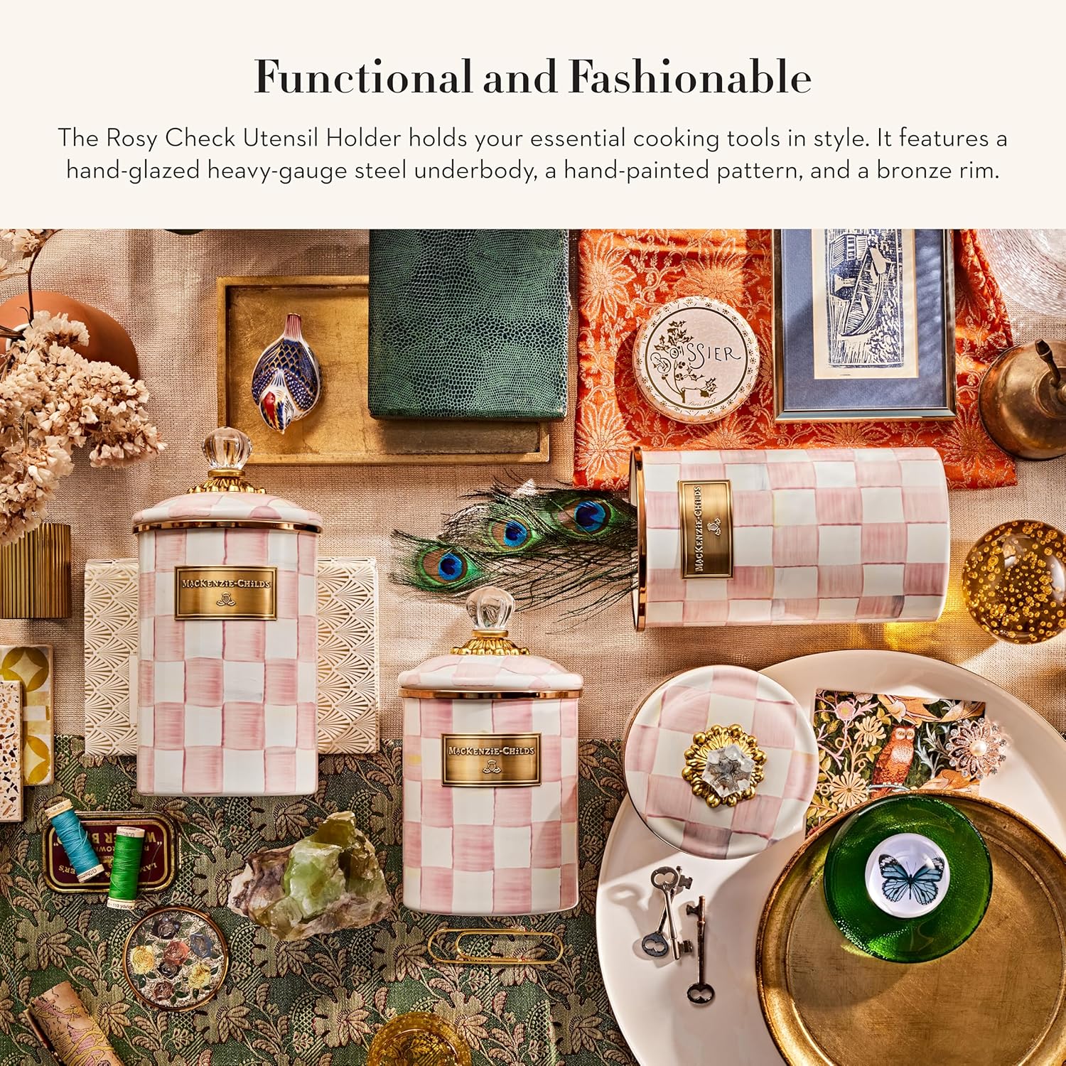 MACKENZIE-CHILDS Enamel Utensil Holder, Kitchen Utensil Holder for Countertop, Storage Caddy, Pink-and-White Rosy Check
