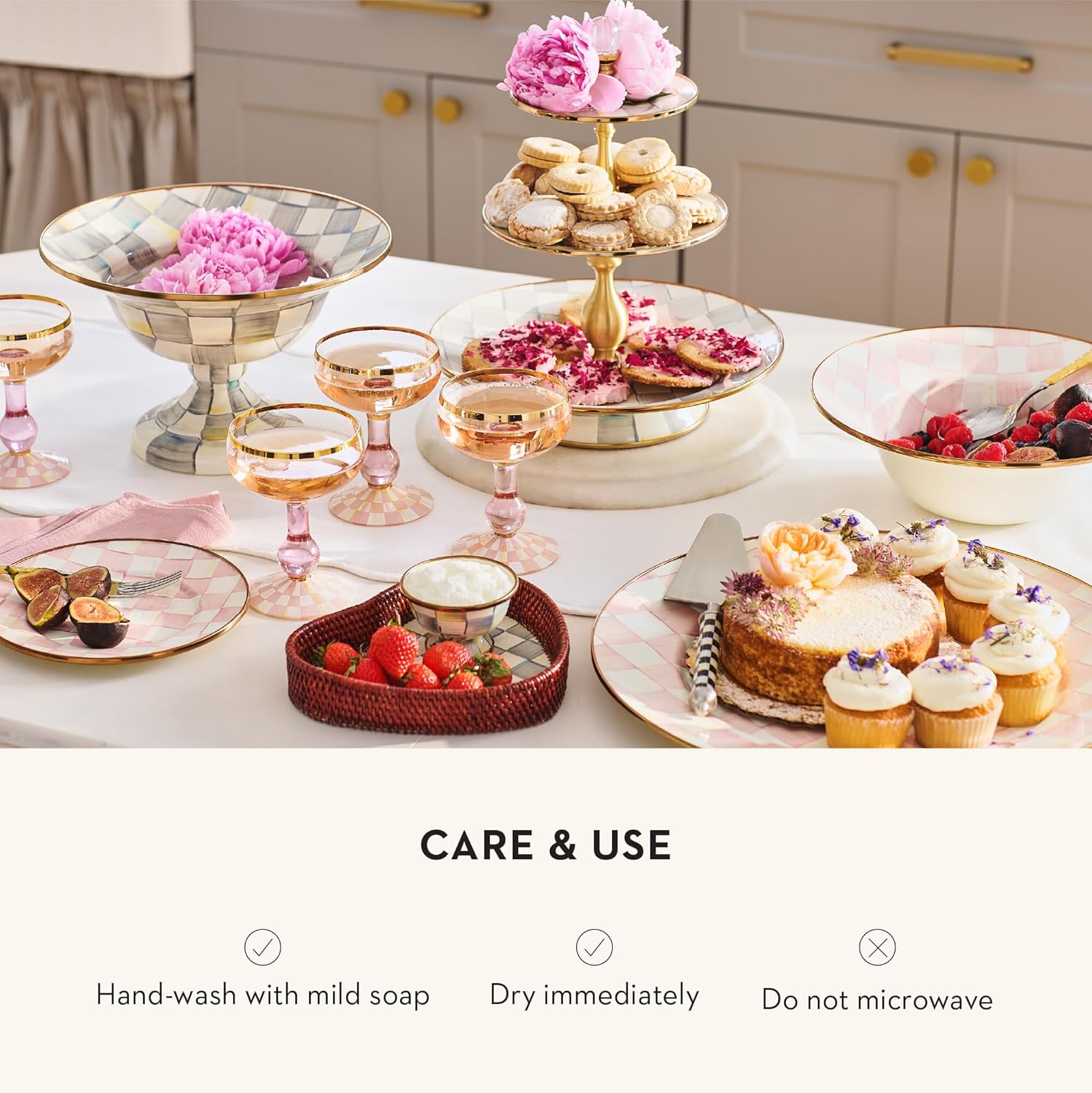 - ENTERTAINING ESSENTIAL: Serving platters for entertaining don’t get any more pretty, pink, or classic than this. Our Rosy Check platter features glossy hand-painted pink-and-white checks in a range of rosy hues and has a hand-glazed heavy-gauge steel underbody and a bronzed stainless-steel rim.