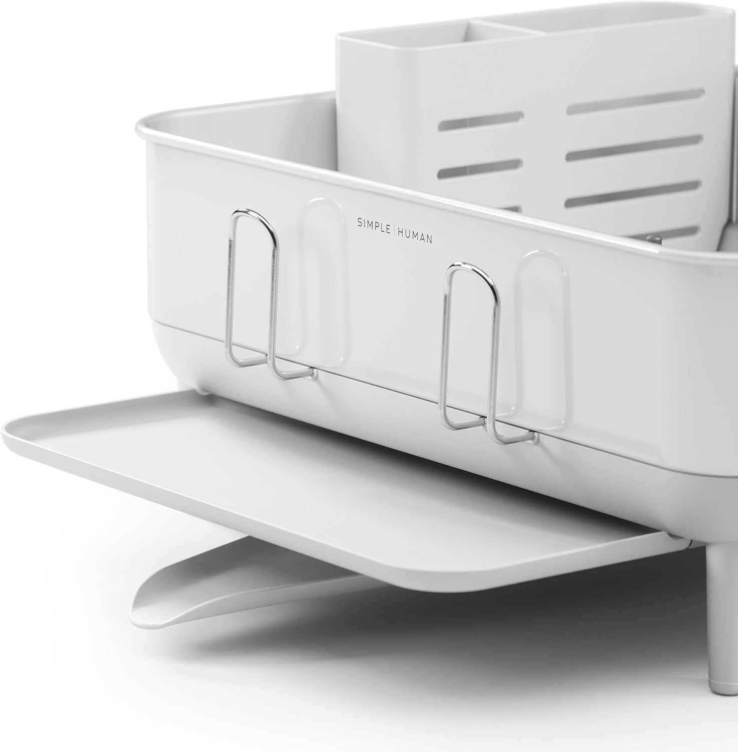 simplehuman Compact Dish Drying Rack with Stainless Steel Frame, 360º Easy Drain Swivel Spout, Utensil Holder, Anti-Residue Coating, Moisture Control Surface, White