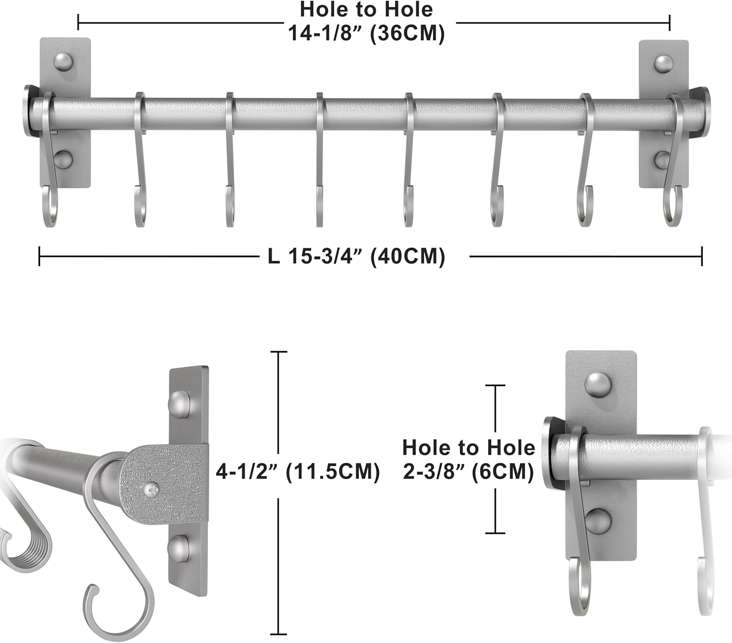 - Easy to install, sizes: 15-3/4 L x 4-1/2 H x 1-5/8 inch, including 1 x kitchen rail with 8 S hooks, mounting hardware, silver color,