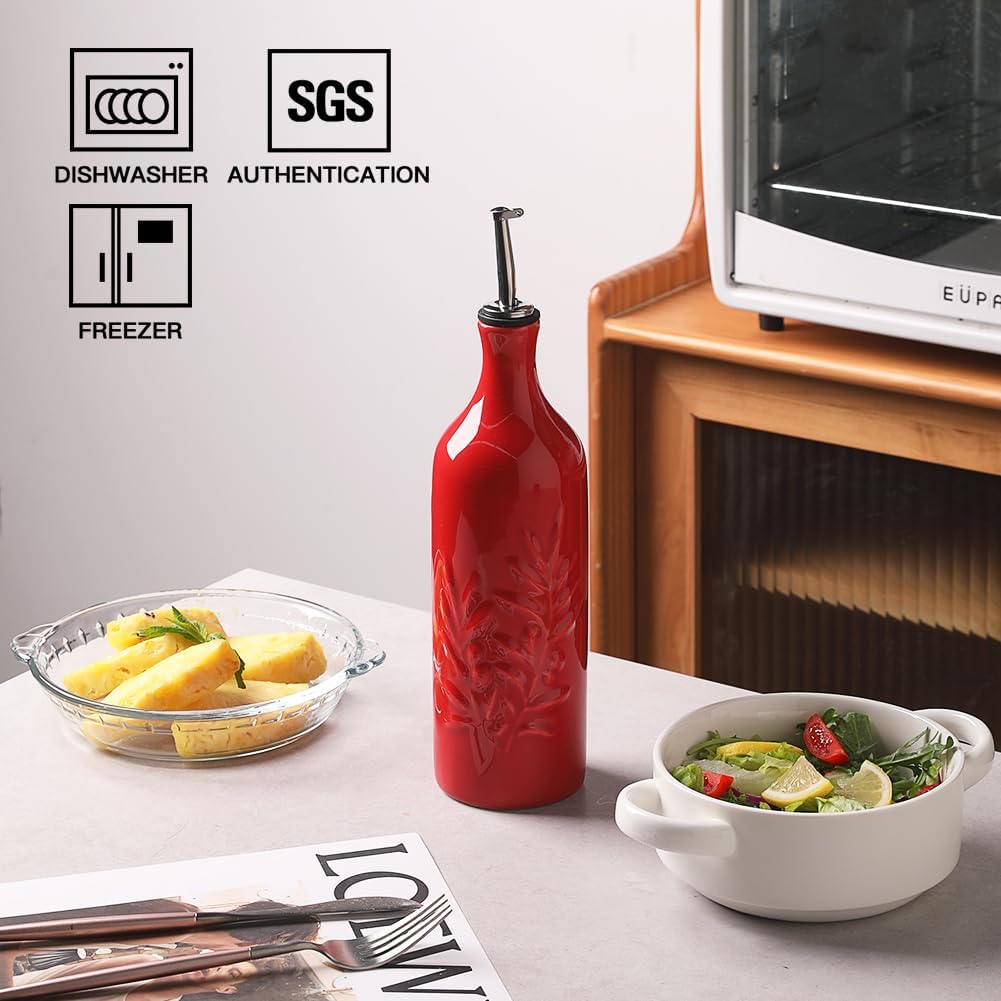 Sweejar Large Ceramic Olive Oil Dispenser Bottle, 24 Oz Relief Opaque Oil Cruet Protects Oil To Reduce Oxidation, Storage Vinegar, Soy Sauce, Coffee Syrup, Liquids, Set of 1 (Red)