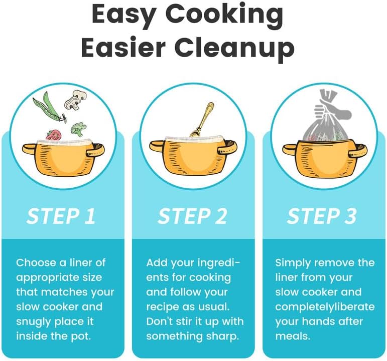 - 【Easy to Use】Three packs, each pack contains 10 slow cooker liners, sized 10"x13", stacked individually in a resealable bag for easy single-sheet use. Just line your slow cooker, cook, and toss for a No-hassle clean-up