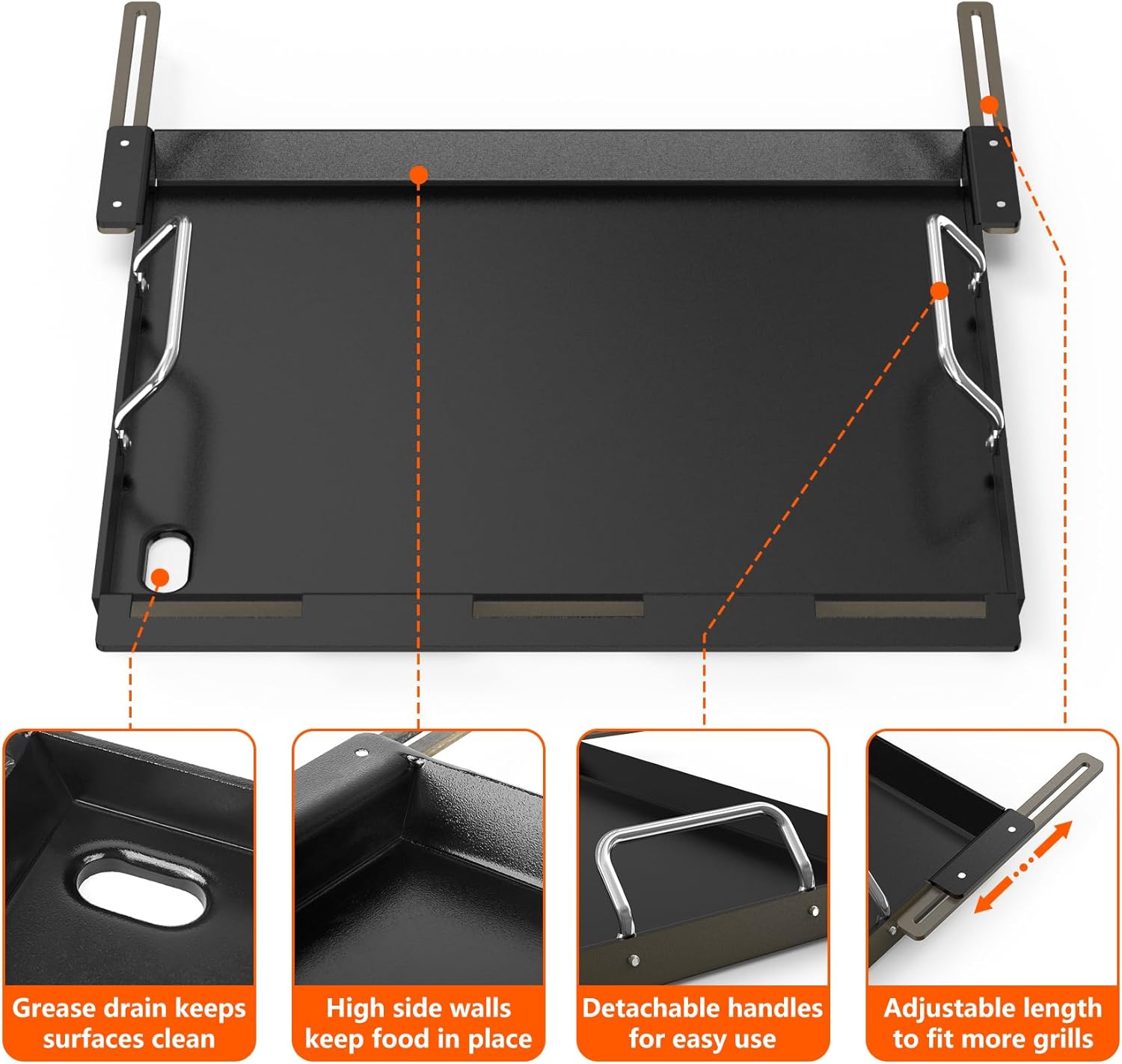 - Easy Cleanup: Large grease hole to drain grease and debris, prevent splattering and keep cooking surfaces clean. Features side handles for easy conversion or removal from the grill.