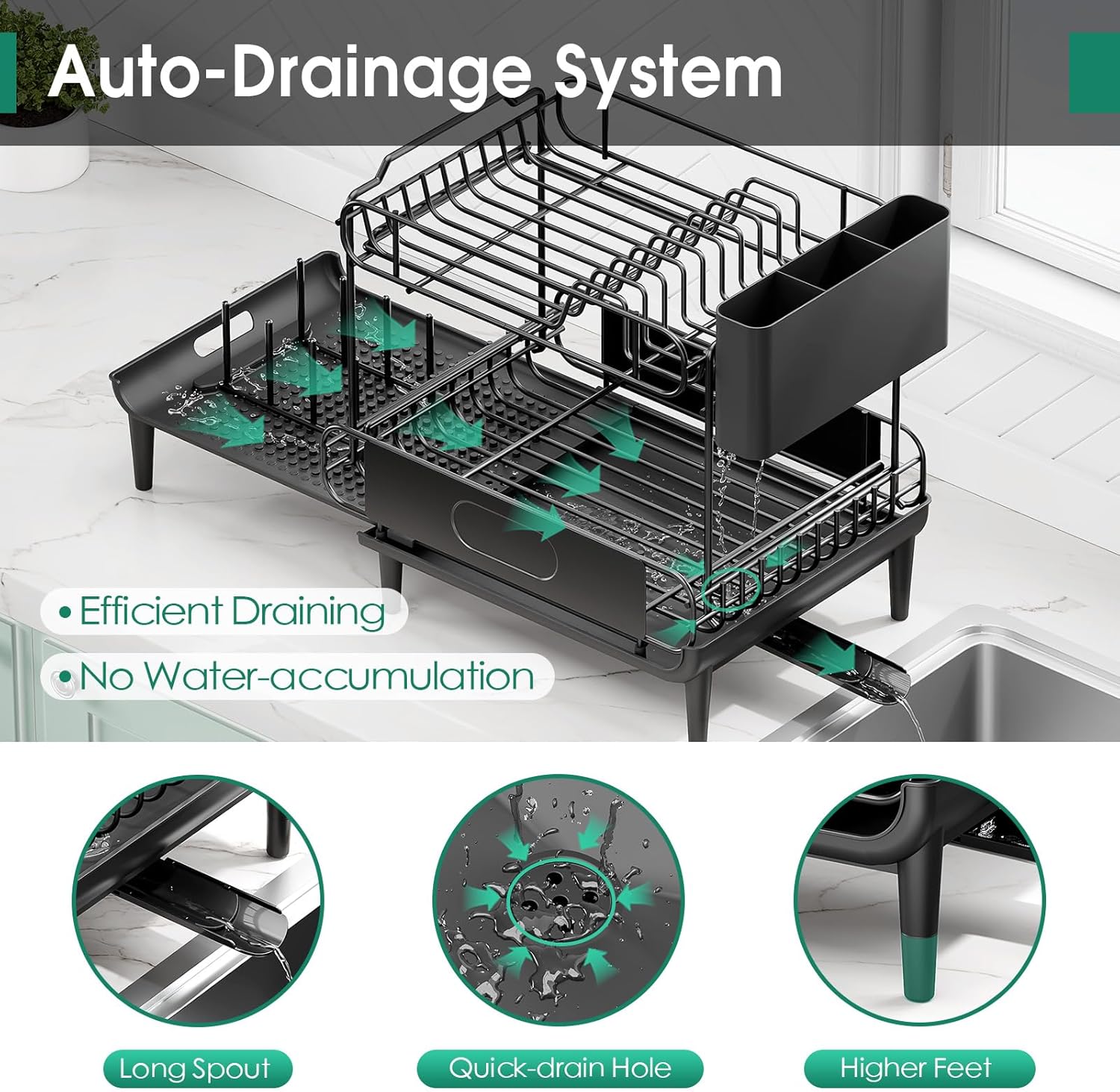 Dish Drying Rack for Kitchen Counter, Expandable 2 Tier Dish Rack, Large Capacity Dish Drainer with Drainboard Multifunctional Dish Strainer with Removable Cutlery Holder Black