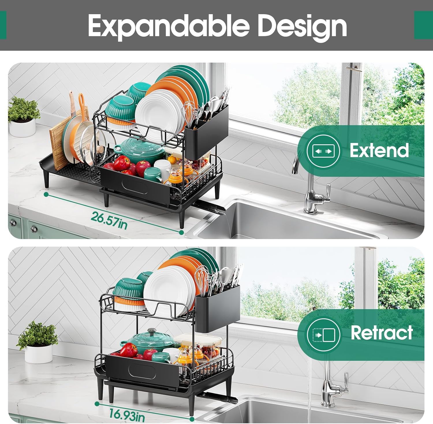 - ăExpandable DesignăOur expandable 2-tier dish drainer set is designed for the big family. The dish rack expands from 14.2 to 26.8 inches. When foldable, itâs compact enough to place on countertop without taking much space. After extended, it's larger capacity is perfect for all kind of dishware.