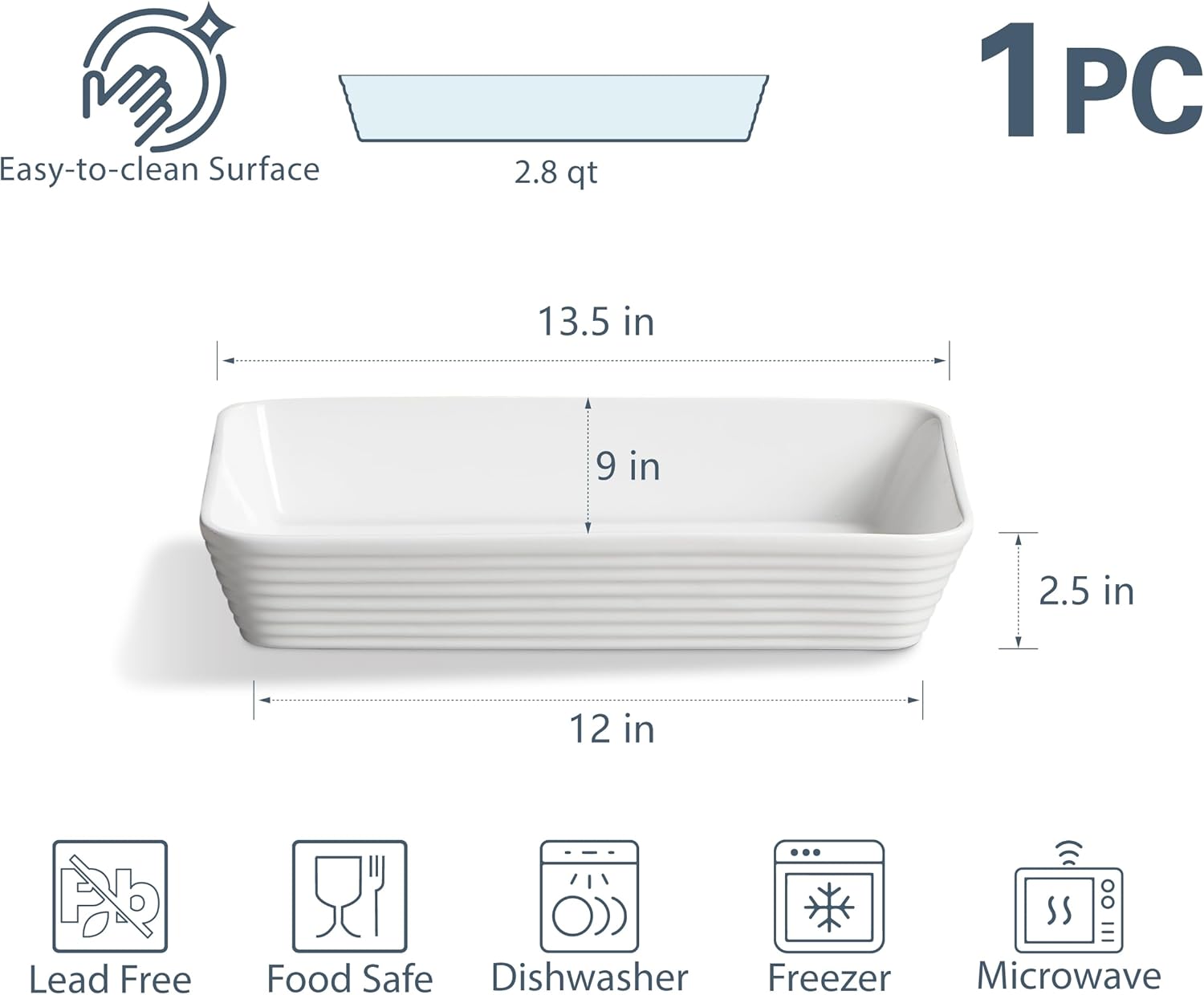 ONEMORE Ceramic Baking Dish, 9x13 Baking Pan Casserole Dish Large Rectangular Baking Dishes for Oven Deep Dish Lasagna Pan for Family Meals Ribbed White Bakeware for Roasting & Serving