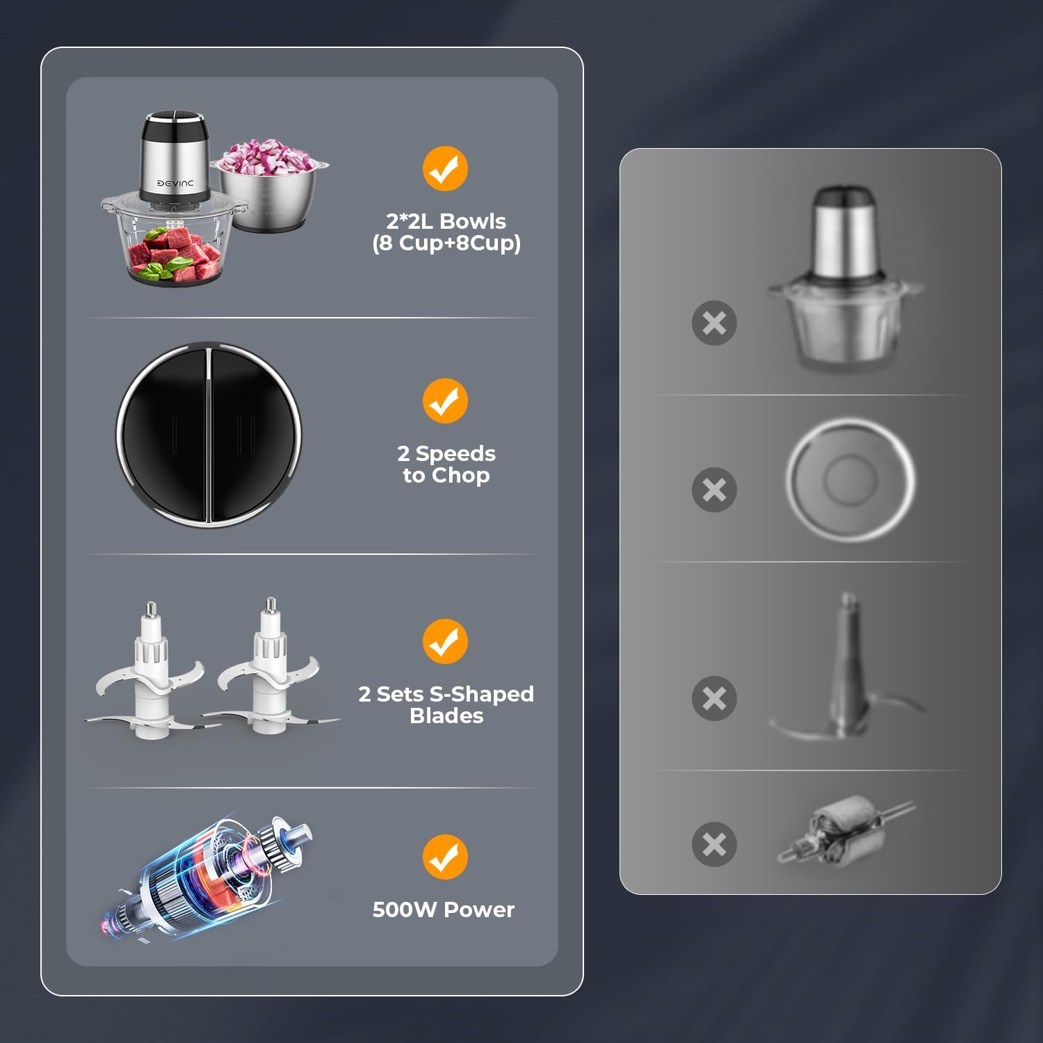 Food Processors, Mini Meat Grinder & Veggie Chopper with 2 Bowls (8 Cup+8 Cup), Electric Food Chopper with 2 Sets of Bi-Level Blades for Meat, Vegetables, Fruits and Nuts