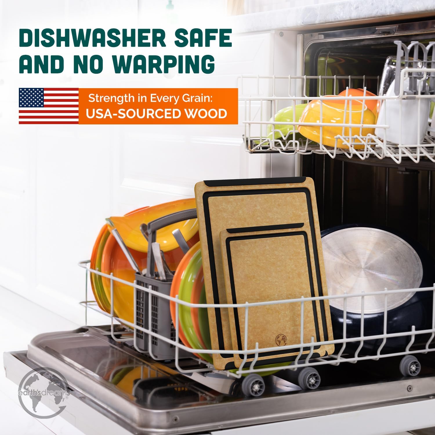 - WOOD COMPOSITE CUTTING BOARDS - This set is the best cutting boards for kitchen set you can get! Made from high-temperature-pressed paper composite material from wood fiber, they offer durability & efficiency without water absorption. This helps prevent cracks, splinters, peels, & even odors over time. Lightweight Dishwasher Safe Alternative to Bamboo