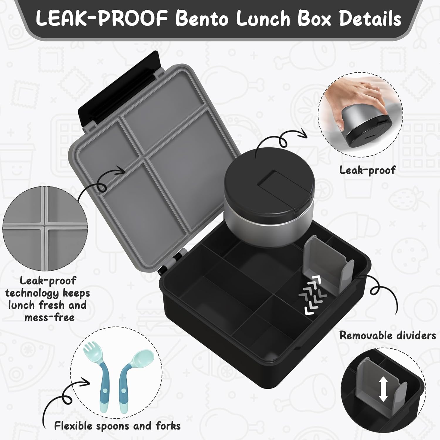 Bento Lunch Box with 8oz Soup Thermo, Leak-Proof Lunch Containers with 4 Compartment, Thermo Hot Food Jar and Insulated Lunch Box for School Black