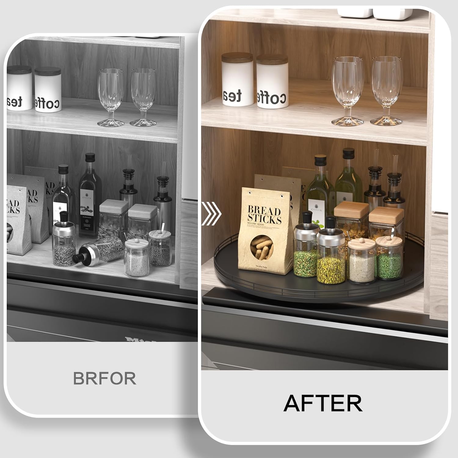 - ๐ง๐ต๐ผ๐๐ด๐ต๐๐ณ๐๐น ๐๐ฒ๐๐ถ๐ด๐ป: The turntable tray features a smooth and silent 360ยฐrotation; Bottom slip-resistant pads for stability and protect your countertop from scratches; Raised edges on each organizer tray to keep items from falling out; Easy to use, no installation required