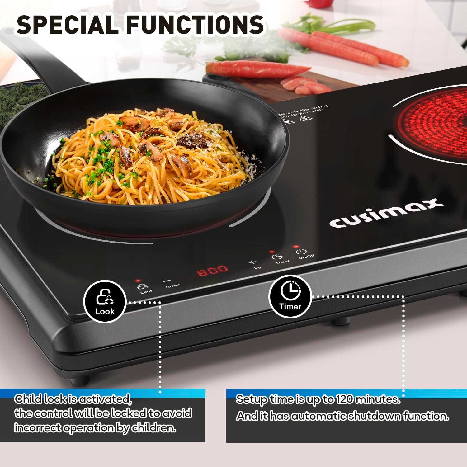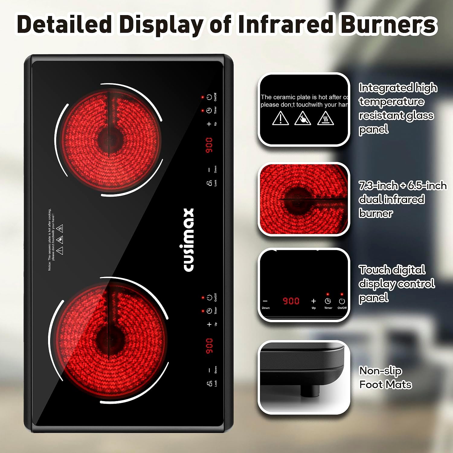 Electric Stove,Cusimax Electric Hot Plate for Home,9 Temperature and 1800w Power Level,Double Infrared Burner with Sensor Touch,Kids Safety Lock,Timer,Ceramic Countertop Stove