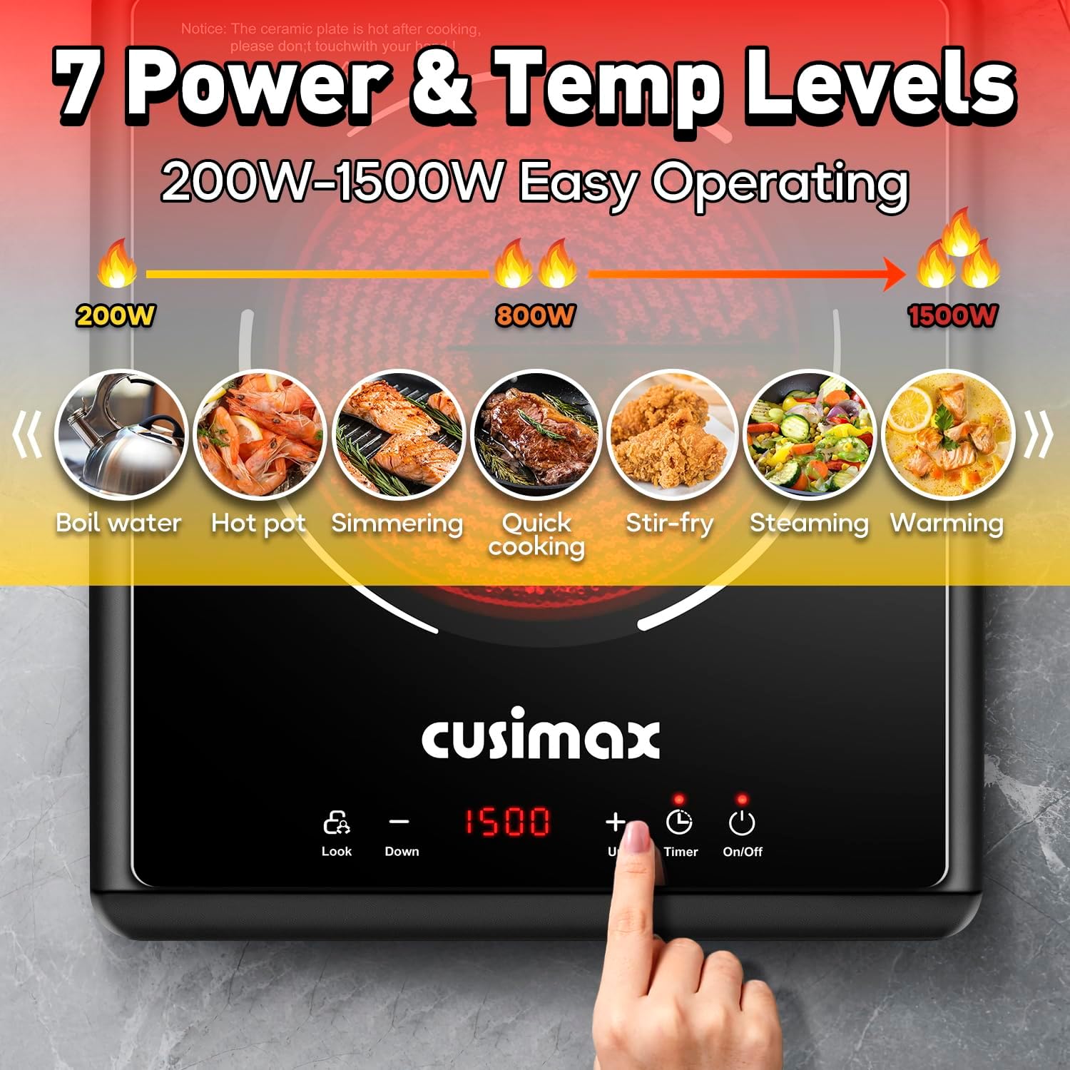 - 7 TEMPERATURE CONTROLS:electric stove with 1500W of high power.7 Power Level 200w to 1500w.CUSIMAX Countertop Stove to be heated uniformly;provides quick heat-up and greatly reduce cooking time,more efficient than traditional gas,saving time and energe!Easy to frying, boiling,steam,slow boiling and so on.