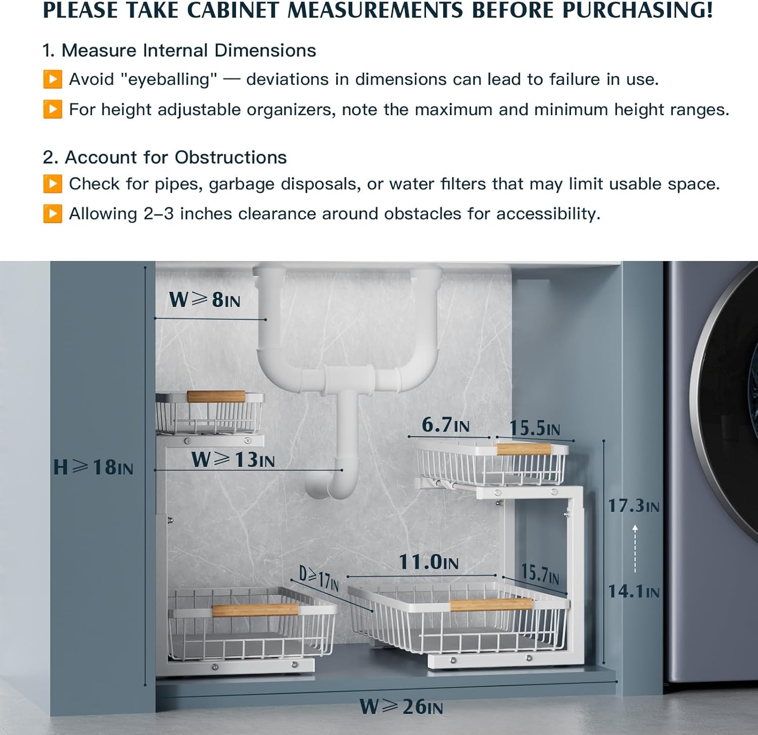 - Multi-scenario Application & Space Saving: The undersink organizers bathroom are able to serve as basic storage shelves for food, spices, toiletries, office supplies and cleaning supplies in the kitchen, bathroom, study room, laundry and living room.