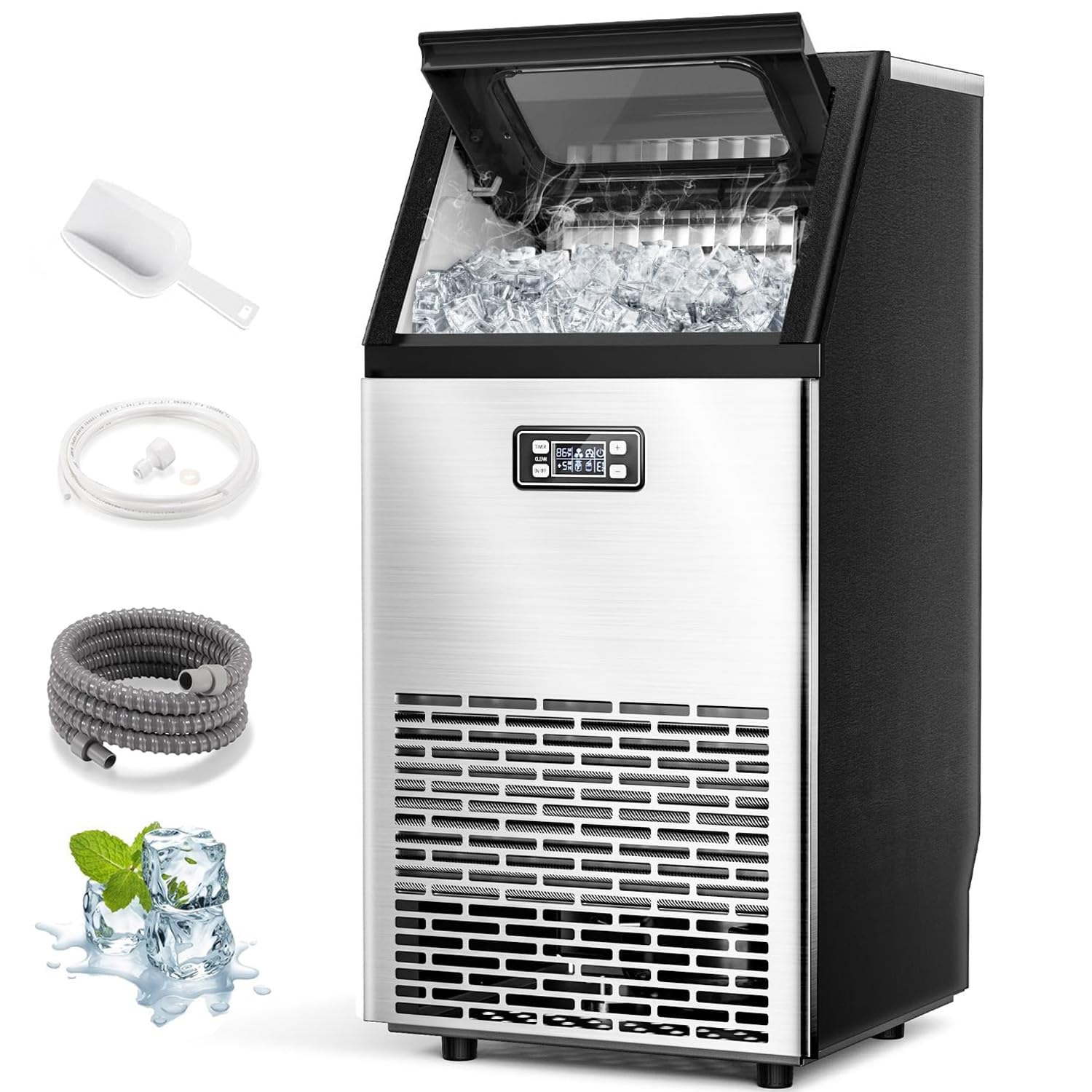 - 【High Quality Material】The commercial ice maker machine is durable and safe for its body’s three-layer materials: food-grade ABS, thermal insulation and a solid stainless cover.